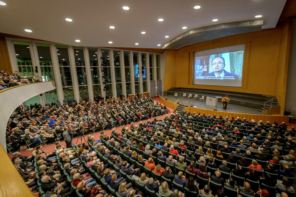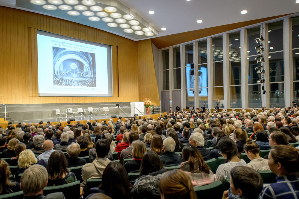 Für viele war es ein Wiedersehen nach Jahrzehnten: Unter den rund 1300 Gästen, die am Dienstagabend in den Henry-Ford-Bau gekommen waren, um den siebzigsten Geburtstag der Freien Universität zu feiern, waren zahlreiche Studentinnen und Studenten der ersten Jahre. Darunter sogar einige derjenigen, die im Jahr 1948 mitgeholfen hatten, die Freie Universität zu gründen. Eine Universität, die es sich zur Aufgabe gemacht hatte, Freiheit und Demokratie zu lehren, wie Literaturnobelpreisträgerin Herta Müller in ihrer Festrede sagte. Gelegenheit für einen Blick zurück gab es auch außerhalb des Festsaals: Aus Anlass des runden Geburtstages hatte die Universität universitätsweit einen „dies academicus“ zu Geschichte und Gegenwart der Universität ausgerufen.