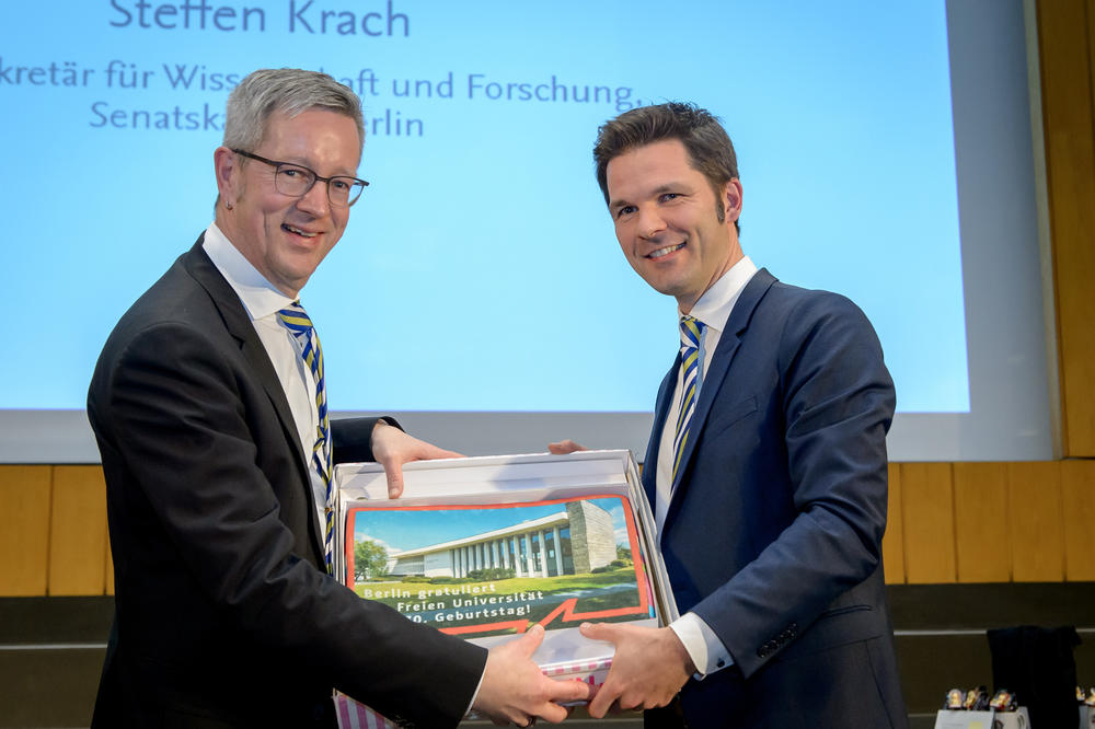 Die Freie Universität präge ihre Absolventinnen und Absolventen, betonte Steffen Krach, Staatssekretär Wissenschaft und Forschung beim Berliner Senat, der vor 16 Jahren selbst ein Studium in Dahlem begann. „Damals ahnte ich nicht, dass ich auf dieser Bühne einmal der Freien Universität zum Siebzigsten gratulieren würde. Ohne die Freie Universität wäre Berlin eine andere, eine ärmere Stadt“, sagte Krach, der Universitätspräsident Professor Günter M. Ziegler eine Geburtstagstorte überreichte.