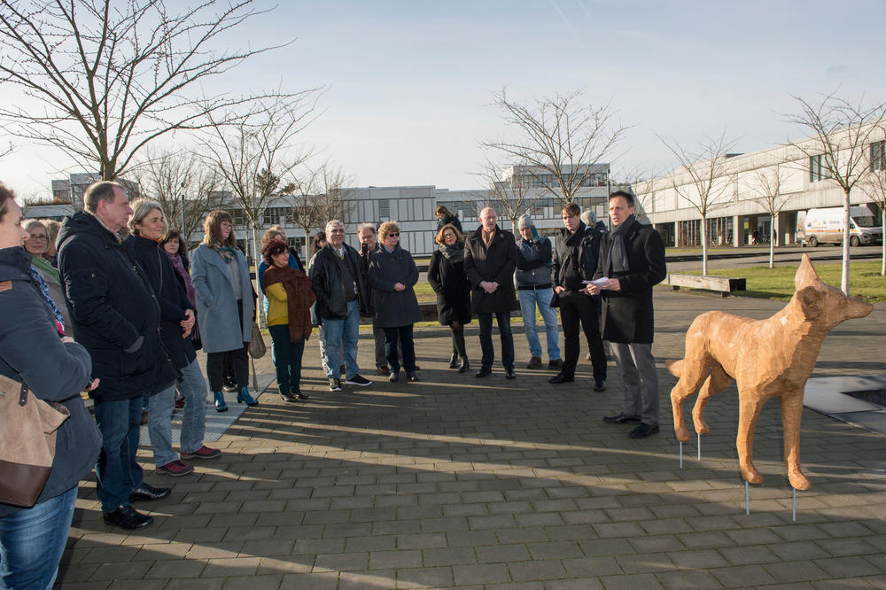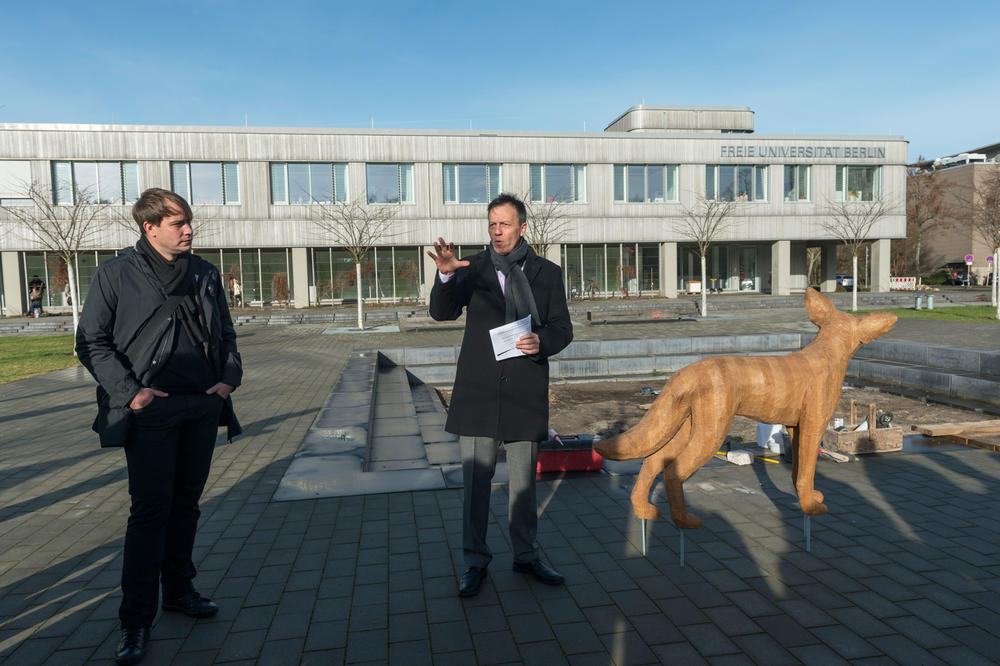 Zur Einweihung kam sogar kurz die Sonne heraus an diesem ansonsten grauen Januar-Morgen. Während Holzbildhauer Sebastian Hertrich gemeinsam mit den Steinmetzen Roland Luchmann und Frederik Frövel den gut 100 Kilogramm schweren Holzkojoten mit Metallstäben im Boden befestigten, erläuterte der Künstler Robert Patz das Konzept seiner Trickster-Figur: Der Trickster (abgeleitet vom englischen Wort „trick“, Betrug, Kniff; Französisch: „tricher“, mogeln, betrügen) ist eine mythologische Figur – ein Schelm, Betrüger, Tölpel – der die göttliche Ordnung bewusst durcheinanderbringt und Regeln in Frage stellt. Sein Kojote, so Patz, verkörpere den „Trickster“, wie ihn die Biologin und Wissenschaftstheoretikerin Donna Haraway versteht: eine Figur, die der Welt entspricht: „Weil die Welt den Fragen der Wissenschaft und dem Streben nach Forschung stets ausweicht. Immer wenn wir etwas entdecken oder Fragen beantworten, entstehen wieder neue Fragen.“