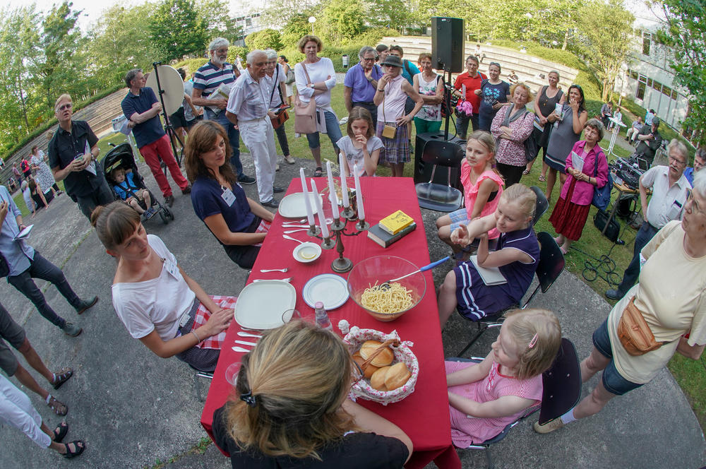 Imkermeister Benedikt Polaczek präsentierte einen Freiflugkasten für Bienen und Hummeln – und konnte so auch zunächst zurückhaltende Besucherinnen und Besucher dank Sicherheitsabstand zum Insektenbeobachten einladen. Nach der Verkostung des hauseigenen Honigs lud Japanologieprofessorin und Vizepräsidentin Verena Blechinger-Talcott nach Japan ein: Bei Mugicha – Gerstentee – und Matcha-Keksen erklärten Studierende die Origami-Faltkunst und zeigten, wie ausländische Namen in Katakana, einem japanischen Schriftsystem, geschrieben werden. „Aus Günter müssen wir leider Ginter machen“, meinte Blechinger-Talcott scherzend zum Präsidenten, „denn ein ‚ü‘ kennt das Japanische nicht.“