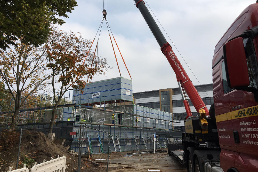 Vor etwa einem Jahr, im vergangenen Oktober, hingen die Laborräume noch an einem großen Kran in der Luft – wenige Monate später waren sie schon in Betrieb: Die 45 Mitarbeiterinnen und Mitarbeiter zweier Arbeitsgruppen der Organischen Chemie, der Gruppen von Professorin Beate Koksch und von Professor Christoph Schalley, konnten in den neuen, teils dreistöckigen Modulbau mit 530 Quadratmetern Grundfläche einziehen.