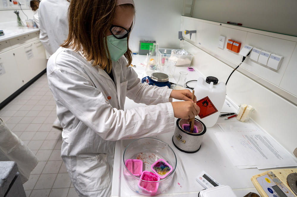 In den Labors, wo sonst Berliner Schulklassen ihren Praxisunterricht absolvieren, können sie mit Seife und Spüli experimentieren oder eine „Methan-Mamba“ – ein schaumig-luftiges Gebilde – auf ihrer Handfläche in Flammen aufgehen lassen. Bei dieser Reaktion verbrennen Methangas und Sauerstoff aus der Luft zu Kohlenstoffdioxid und Wasser, erklären Lehramtsstudierende, die in wechselnden Schichten die Experimente anleiten.