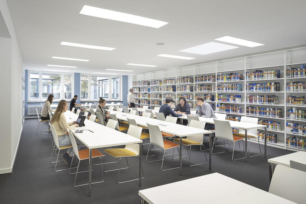 Diese tageslichtarmen Zeiten sind nun vorbei: Die neue Bibliothek besticht durch ihre hellen, sonnigen Räume. Im Foyer, in zwei Lesesälen, im Korridor, in zwei Atrien, zwei Separees und einem Atelier sind Lernorte entstanden, die den unterschiedlichen Bedürfnissen der Studierenden und Forschenden Rechnung tragen: von Einzelarbeitsplätzen zum konzentrierten Lernen bis hin zu Gruppenräumen mit moderner Präsentationstechnik. Außerdem wurde ein PC-Pool eingerichtet, in dem auch von der Bibliothek angebotene Kurse und Schulungen stattfinden, und es gibt Orte, die die Teilnahme an Online-Veranstaltungen im Rahmen der hybriden Lehre ermöglichen.