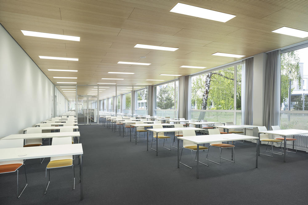 Für die Farbgestaltung der Wände, Decken und Böden wurden mithilfe des Amtes für Denkmalschutz die ursprünglichen Farben seit Entstehung des Baus in den Jahren 1957 und 1958 rekonstruiert. Der teilweise retrospektive Innenausbau, kombiniert mit dem Einsatz modernster Technik, soll den Studierenden einen behaglichen und zugleich modernen und hoch funktionalen Lernort bieten.