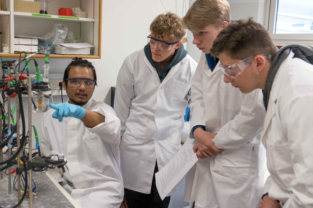 Leif, Paula, Valerie, Tim und Janne sind konzentriert bei der Sache. Die Schüler*innen fertigen im Labor des Physikprofessors Holger Dau Elektrodenfilme an und spalten damit Wasser in Sauerstoff und Wasserstoff. Wenn die Elektroden mit Strom aus erneuerbaren Energiequellen gespeist werden, entsteht „grüner Wasserstoff“, der eine wichtige Rolle in der Energieversorgung der Zukunft spielen soll.