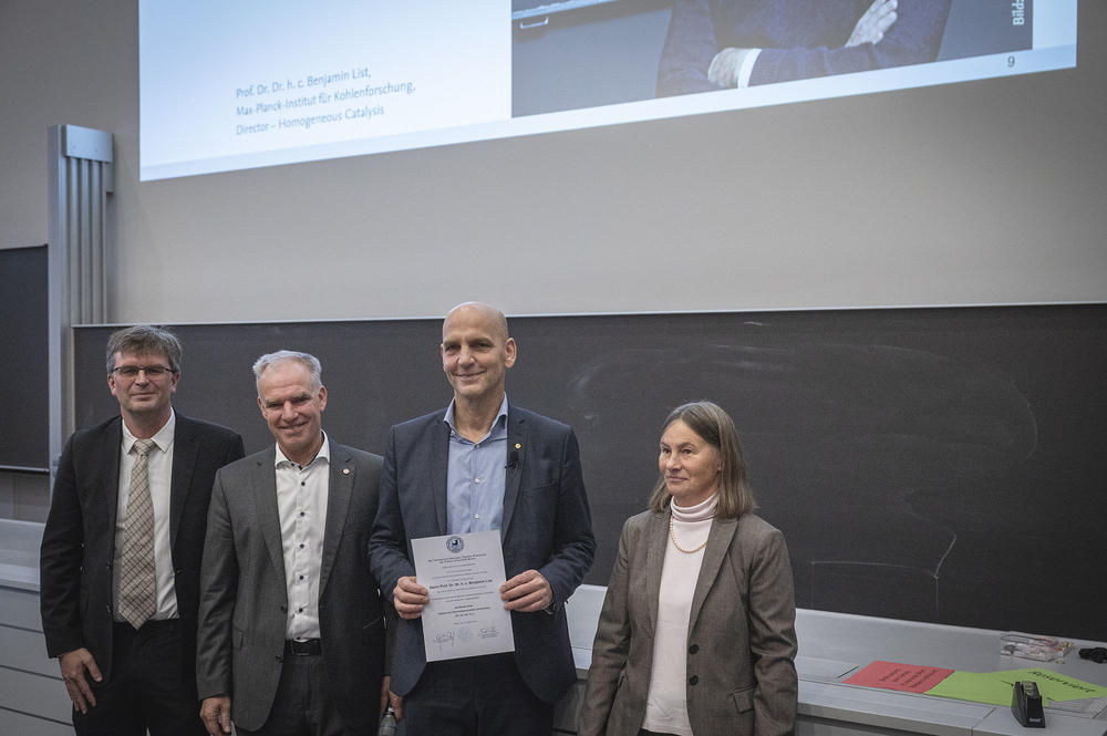 Er schüttelt viele Hände, eilt von einem Gespräch zum nächsten, steht für Selfies zur Verfügung. Benjamin List ist die heimliche Hauptperson im Hörsaal, der sich schnell füllt – schließlich ist nicht jeden Tag ein Nobelpreisträger auf dem Campus zu Gast. Und wenn es für Naturwissenschaftler*innen so etwas wie Glamour gibt, dann ist dieser mit einer goldenen Medaille aus Stockholm verbunden.