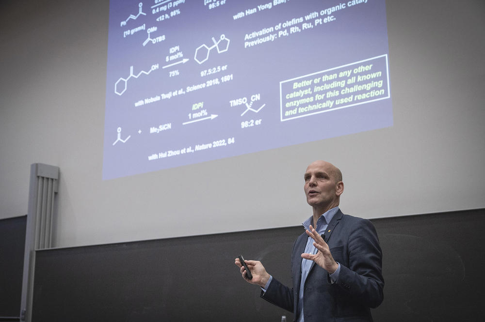 Anschließend beschreibt er selbst noch einmal seine folgenreiche Entdeckung am Scripps Research Institute und kommt danach auf seine weitere Arbeit, seine fortwährende Suche nach universell einsetzbaren Katalysatoren, zu sprechen. Es wird sehr chemisch, doch das Publikum hört gerne zu, denn hinter seinen Formeln stecken Geschichten – von neuen Ideen, Rückschlägen und Durchbrüchen: „Wunderschöne Transformationen“, bisher für unmögliche gehaltene Reaktionen, die etwa mit seinem Konzept der „umzäunten“ Katalysatoren plötzlich möglich werden und großen Einfluss auf Forschung und Anwendung haben.
