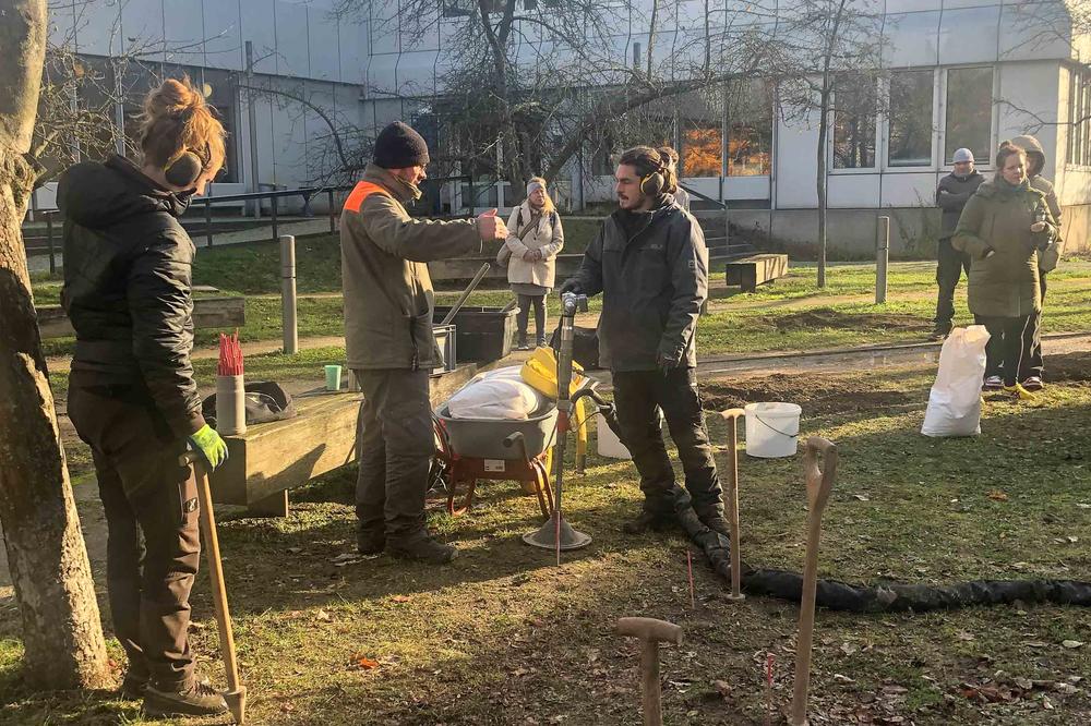Die Bodenökologin hatte derweil mit den Studierenden das Erdreich um die Apfelbäume analysiert. Es war nicht nur sehr feinkörnig und extrem trocken, sondern auch fast frei von üblichen Bodentieren wie Springschwänzen, Milben, Käferlarven und Regenwürmern. „Um die Bodenstruktur zu verbessern, ist eine diverse, ganzjährige Pflanzenbedeckung mit unterschiedlichen Wurzeltiefen nötig“, erklärt Stefanie Maaß. „Das schützt den Boden vor Erosion, beschattet ihn und steigert seine Wasseraufnahmefähigkeit. Durch die Pflanzen fällt zudem vielfältiges organisches Material an, das Bakterien, Pilzen und Bodentieren Nahrung gibt.“ Der Plan: Zwei Blühstreifen sollen angelegt werden. In einer ersten Aktion pflanzten die Studierenden 400 Blausterne (Scilla), Krokusse und Traubenhyazinthen. Diese Frühblüher bieten Wildbienen und anderen Insekten schon Anfang des Jahres Nahrung.