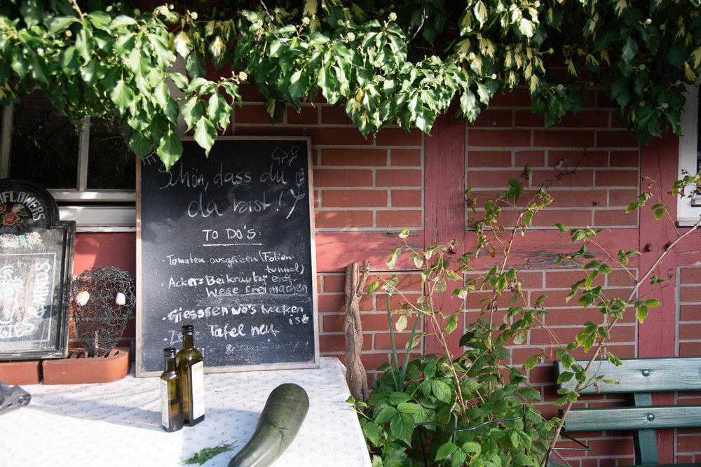 Nils hat die To-dos des Tages auf eine Tafel geschrieben, die vor dem mit Efeu bewachsenen Gartenhaus steht: Tomaten im Gewächshaus ausgeizen, also überflüssige Triebe abknipsen, Beikräuter von den Wegen entfernen, gießen, was trocken ist – und natürlich: ernten! Einfach entspannen sei natürlich auch erlaubt, sagt Nils. Viele kämen aber, um sich nach einem Tag am Schreibtisch auszupowern.