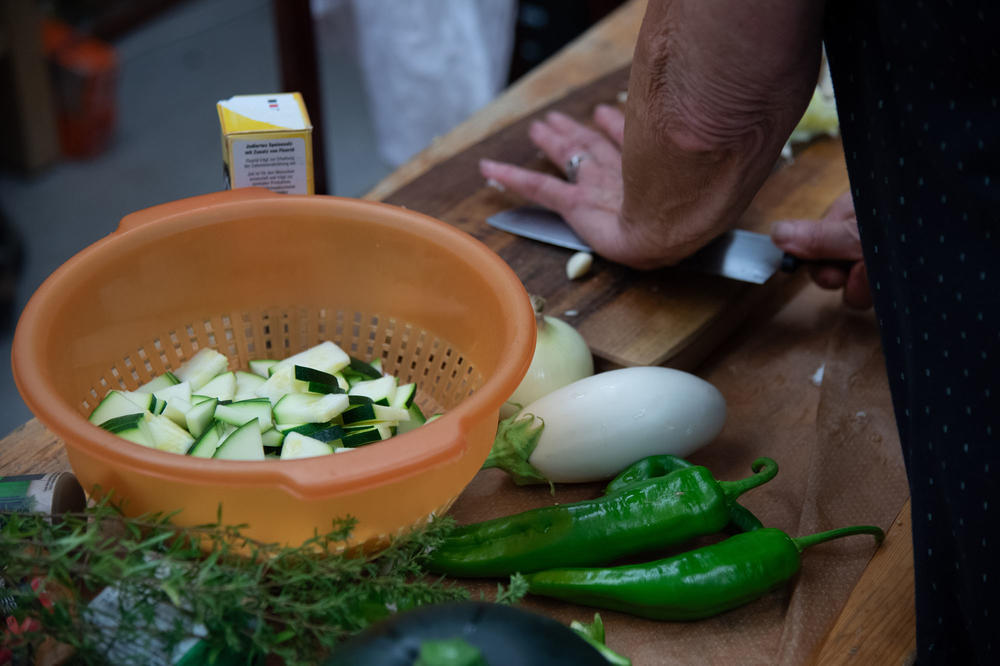 Im Gartenhaus wird die Ernte verarbeitet: Kartoffeln, Möhren, Zucchini, Tomaten, Auberginen, Kräuter – häufig Sorten, die nicht im Supermarkt zu finden sind. Nils freut sich über die mexikanischen Mini-Gurken: klein wie Datteltomaten, und doch grün und knackig. Nur wenige Zutaten stammen nicht aus dem Garten: Quark, Butter, Öl, Hafersahne, Salz und Pfeffer. Maxim und Margot sind heute die Chefs am Herd, Ratatouille und Kartoffeln brutzeln in der Pfanne. Nils bereitet einen Salat mit essbaren Blüten, Noorullah und Marlene schnippeln Pfirsiche, Äpfel, Birne und Feigen für den Nachtisch.