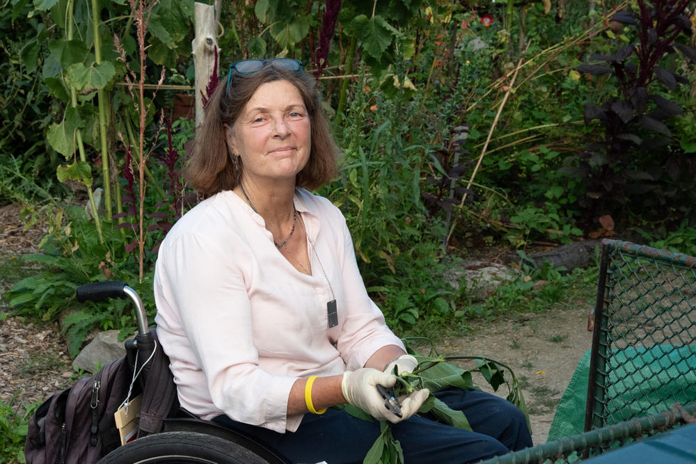 Katharina inspiziert unterdessen das Fenchelkraut. Die Tierfotografin sucht die Schwalbenschwanz-Raupen, die sie neulich dort abgelichtet hat. Der große Tagfalter ist nur selten in Berlin zu finden, das Team war besonders stolz auf die Exemplare. Doch weder Raupen noch Puppen noch Falter zeigen sich heute. Also widmet sich Katharina dem Kompost. Nach einem Arbeitsunfall ist sie auf einen Rollstuhl angewiesen, ihre Arbeitsgeräte hat sie im Rucksack dabei. Auf dem Kompost lagern zu viele unterschiedliche Pflanzenabfälle, stellt sie fest. Zusammen mit Marlene sortiert sie bereits kompostierende Klumpen mit Würmern und trockene Äste in Schubkarren und Eimer. Irgendwann taucht sogar eine alte Sichel aus dem Haufen auf.