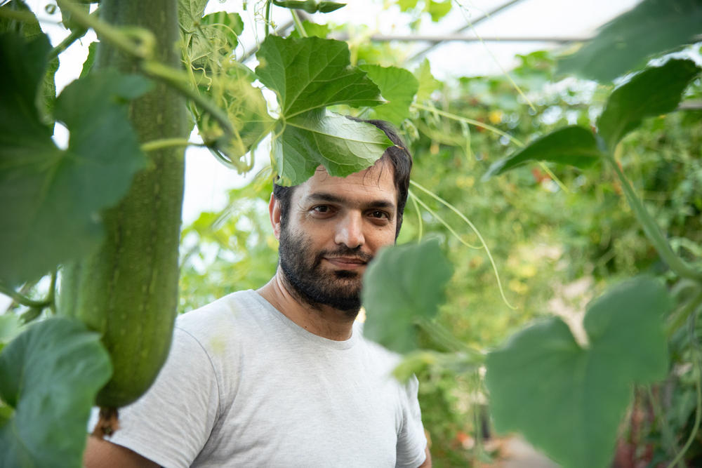 Gut geschützt im Folientunnel gedeihen Tomaten und viele andere biologisch gedüngte Gemüsesorten prächtig. Nils, Marlene und Noorullah (v.l.n.r.) brauchen nur noch zuzugreifen.
