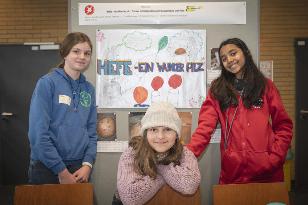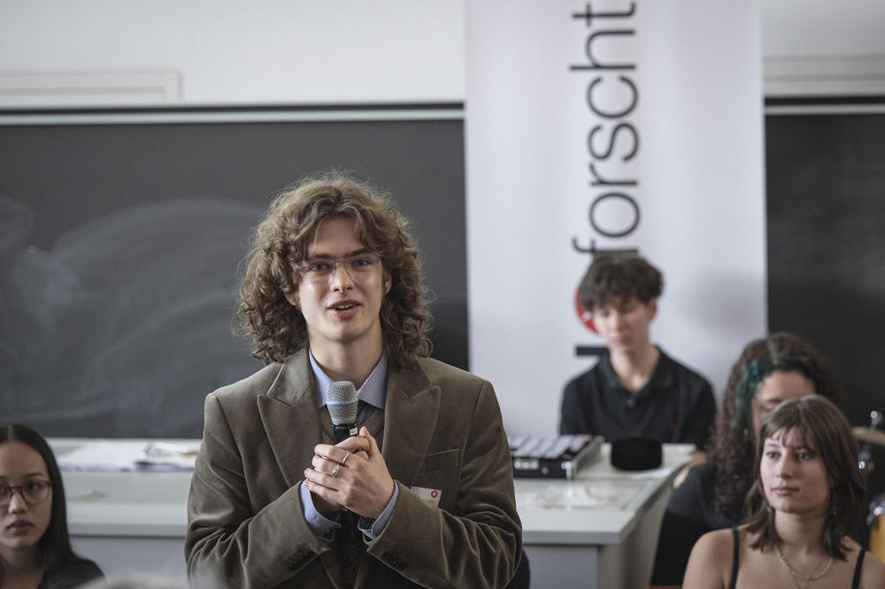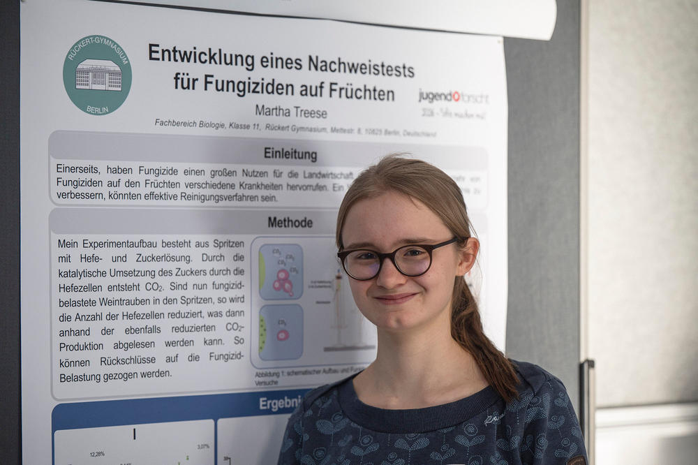 Biochemieprofessor Florian Heyd ist der Einladung gefolgt: „Eine großartige Gelegenheit, forschungsbegeisterte junge Menschen zu treffen und mit ihnen über ihre Ideen zu reden“, sagt er. So eine Veranstaltung gebe ihm Hoffnung für die Zukunft, in Zeiten, in denen die Nachrichten von negativen Meldungen dominiert werden. Die Teilnehmerin und (Spoiler!) Gewinnerin Martha wird er bei der Vorbereitung auf den Landeswettbewerb unterstützen: „Sie darf mit Fungiziden in der Schule nicht arbeiten. Deshalb habe ich ihr angeboten, ihre Experimente bei uns im Labor zu machen.“ Weitere Forschende der Freien Universität haben ihre Hilfe ebenfalls Teams angeboten.