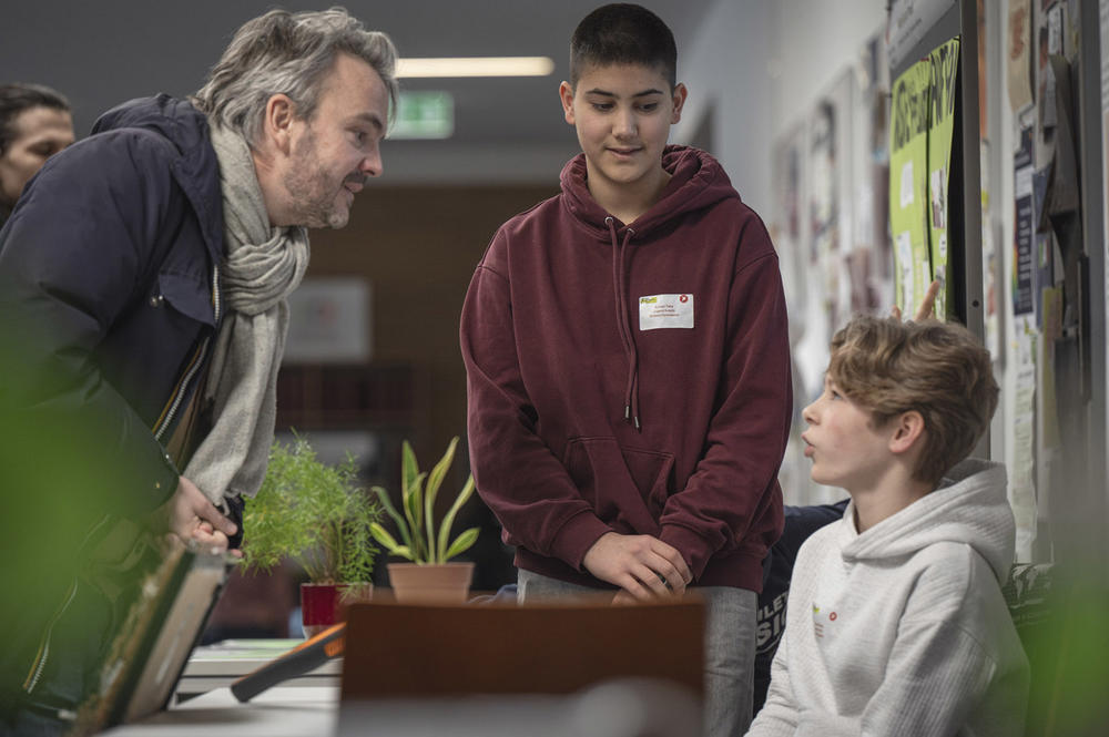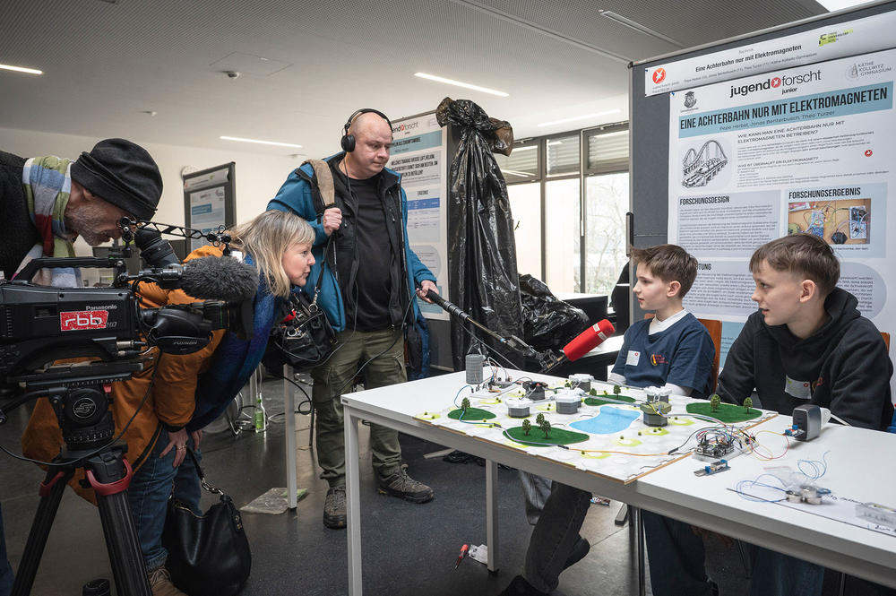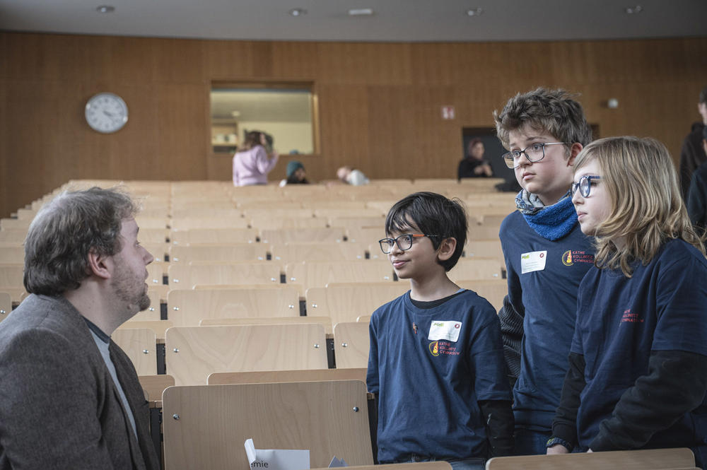 Kurz vor zehn kommt Universitätspräsident Günter M. Ziegler vorbei – eigentlich für die Begrüßungsrede. Vorher wird er für ein Video-Interview abgefangen: Die Schüler*innen Jonathan, Lotte und Laura sind mit Kamera und Mikro unterwegs, den ehemaligen Jugend-forscht-Bundessieger im Fachgebiet Mathematik/Informatik lassen sie sich nicht entgehen: „Wie war das, als Sie bei ,Jugend forscht‘ mitgemacht haben?“, fragt Jonathan. „Das war aufregend, ich war wahnsinnig nervös“, erzählt Günter M. Ziegler. „Ich habe mehrere Anläufe gebraucht, insgesamt drei Mal teilgenommen und eine Menge dazugelernt.“ „Und wie war es, als Sie gewonnen haben?“, fragt Laura. „Großartig. Ich habe es genossen und war sehr stolz“, sagt der Mathematikprofessor. „Und ich habe gemerkt, dass ich etwas kann und bin mit diesem Selbstbewusstsein ins Studium gegangen.“