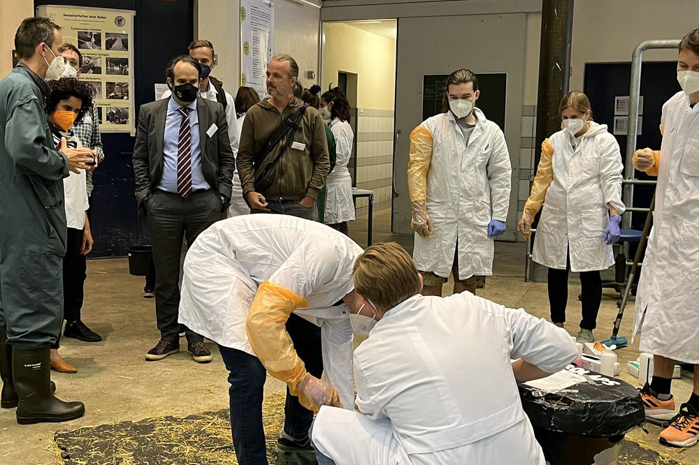 Gemeinsam mit den Gästen sollten der Einsatz von Versuchstieren in der veterinärmedizinischen Ausbildung und die Fortschritte beim Einsatz von Tiermodellen im Studium besprochen werden. Vor Ort informierten sich die Politker*innen in fünf Vorträgen über den aktuellen Stand und diskutierten angeregt mit den Vertreter*innen des Fachbereichs über Herausforderungen, Ziele und Grenzen der modellbasierten Lehre. Veranschaulicht wurde dies bei einem Rundgang über den Campus zu vier Stationen eines weitestgehend modellbasierten Notfallkurses, bei dem sie Studierenden des achten Fachsemesters über die Schulter schauen konnten.