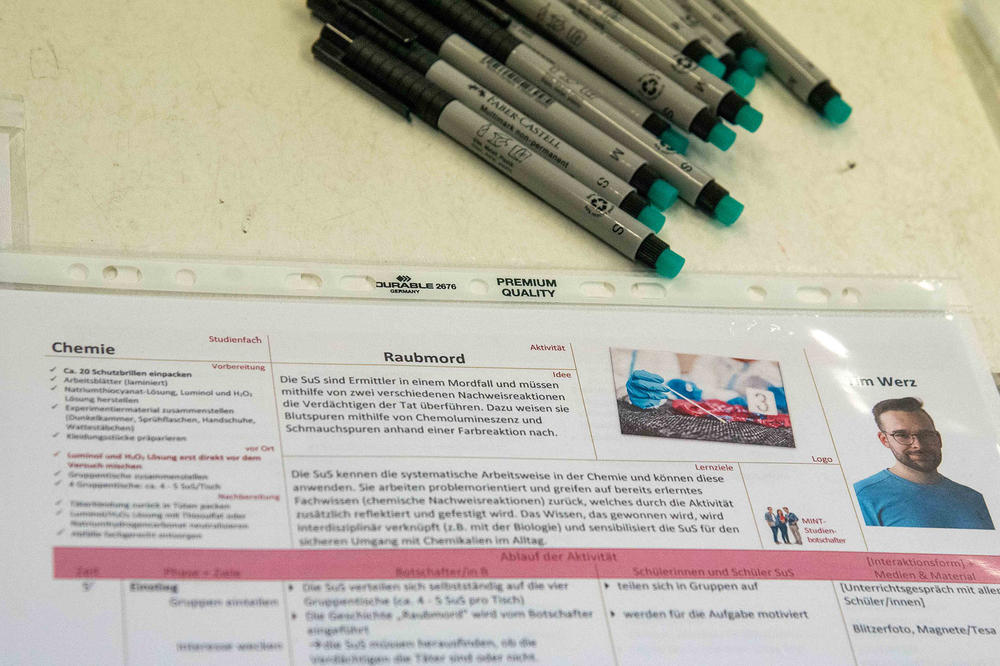 Benjamin Pölloth, der seit einem Jahr Professor für Didaktik der Chemie bei uns ist, hat von einem Programm an der Universität Tübingen erzählt – dort heißt es MINT‑Studienbotschafter und wird von der Doktorandin Anna Haab koordiniert. Wir haben uns mit ihr getroffen und durften das Tübinger Konzept übernehmen. Kern des Konzepts sind spannende Stories und Experimente, um die Rätsel darin zu lösen – etwa: Wer war der Mörder? Wie kann man einen Giftanschlag verhindern?