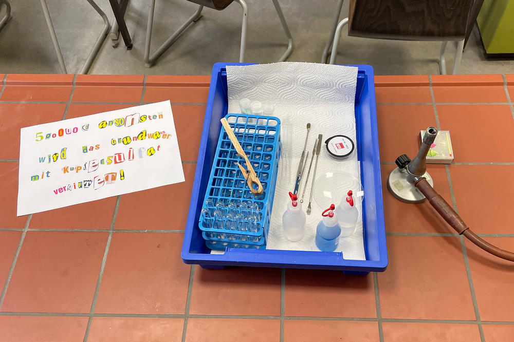 Jedes Team hat sich einen von fünf Versuchen ausgesucht, etwa Textilien mit Naturfarben färben oder ein kriminologisch angelegtes Experiment, bei dem Schüler*innen Blutspuren auf einem Turnschuh und einem Handschuh nachweisen und den Tathergang rekonstruieren. Oder ein Szenario mit einem Giftanschlag, bei dem die Klasse mögliche Stoffe eingrenzt – die Lösung war Kupfersulfat, das im zweiten Schritt aus dem „Trinkwasser“ ausgefällt, also als fester Stoff sichtbar gemacht, wurde, um es unschädlich zu machen.