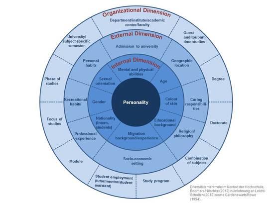 - Organizational dimension: changeable features of diversity that determine the kind of affiliation within the university such as department/institute/academic center/faculty, guest auditor/auditing student from other universities/part-time/complementary studies, degree, doctorate, combination of subjects, study program, student employment (tutor/mentor/student assistant), module, focus of studies, phase of studies, university/subject-specific semester