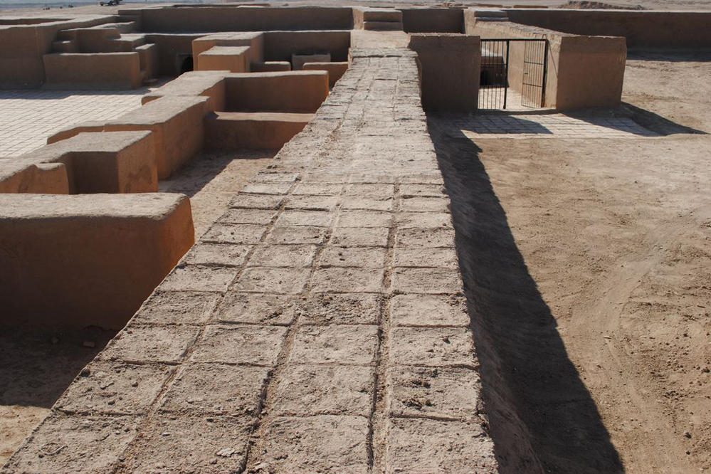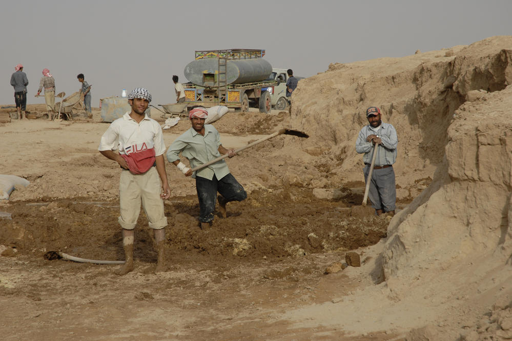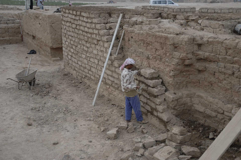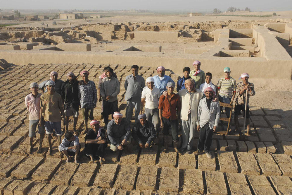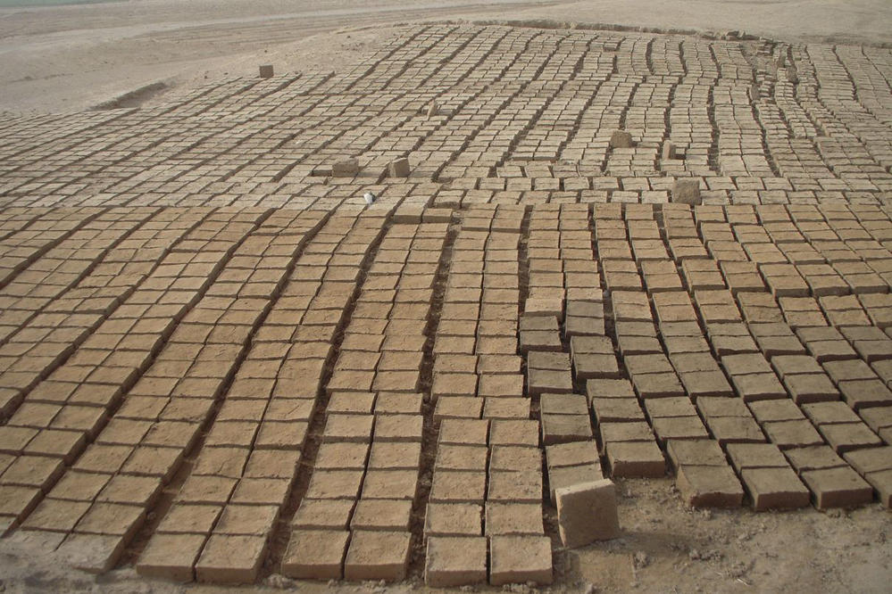 Konventionelle Maßnahmen bestehen darin, die Mauerstümpfe zu sanieren, indem marode Ziegel ersetzt, die Mauerkronen mit neuen Ziegeln ausgebessert und ausgeglichen werden, und das Ganze mit einem schützenden Lehmputz überzogen wird. Die neu herzustellenden Ziegel können normalerweise aus dem ausgegrabenen Lehmziegelschutt hergestellt, quasi „recycled“ werden (Abb. 04). Assyrische Lehmziegel sind quadratisch und haben ein Standardmaß von 38 Zentimeter Seitenlänge und 12 Zentimeter Stärke. Jeder Ziegel wiegt ungefähr fünf Kilogramm (Abb. 05).