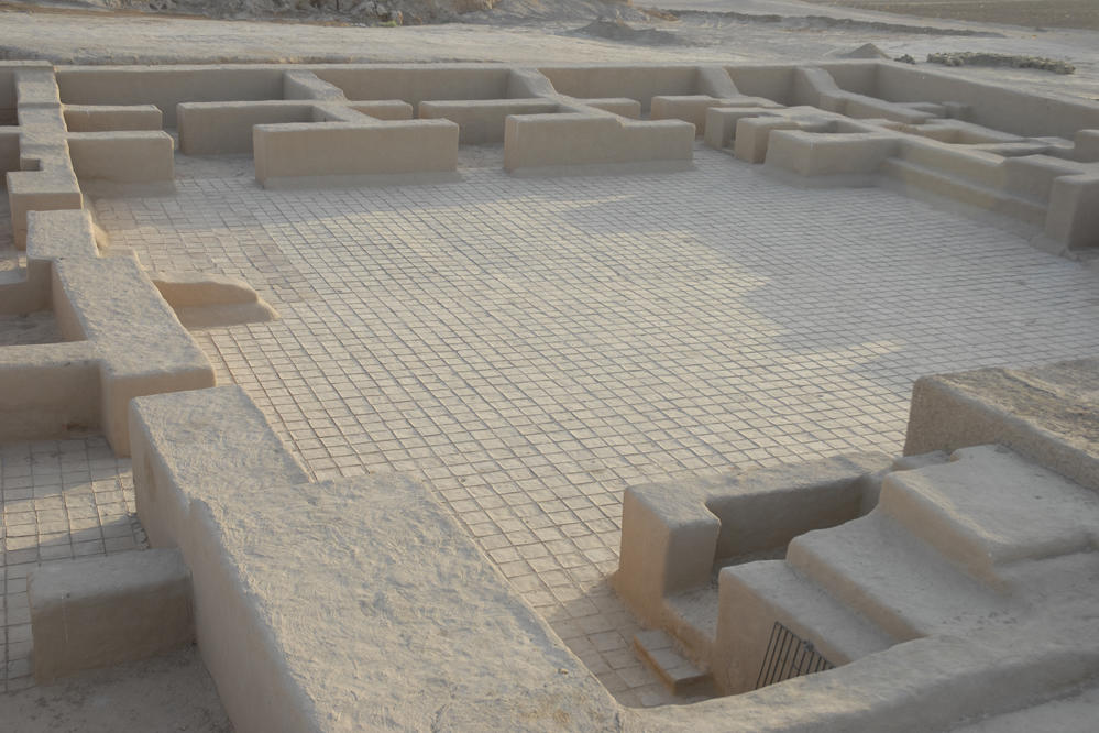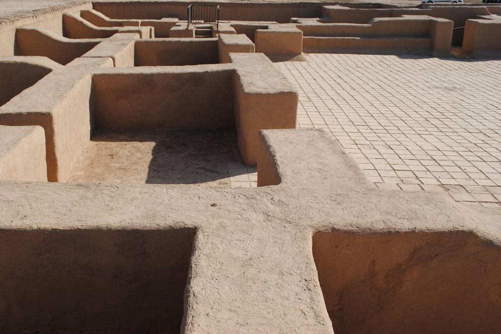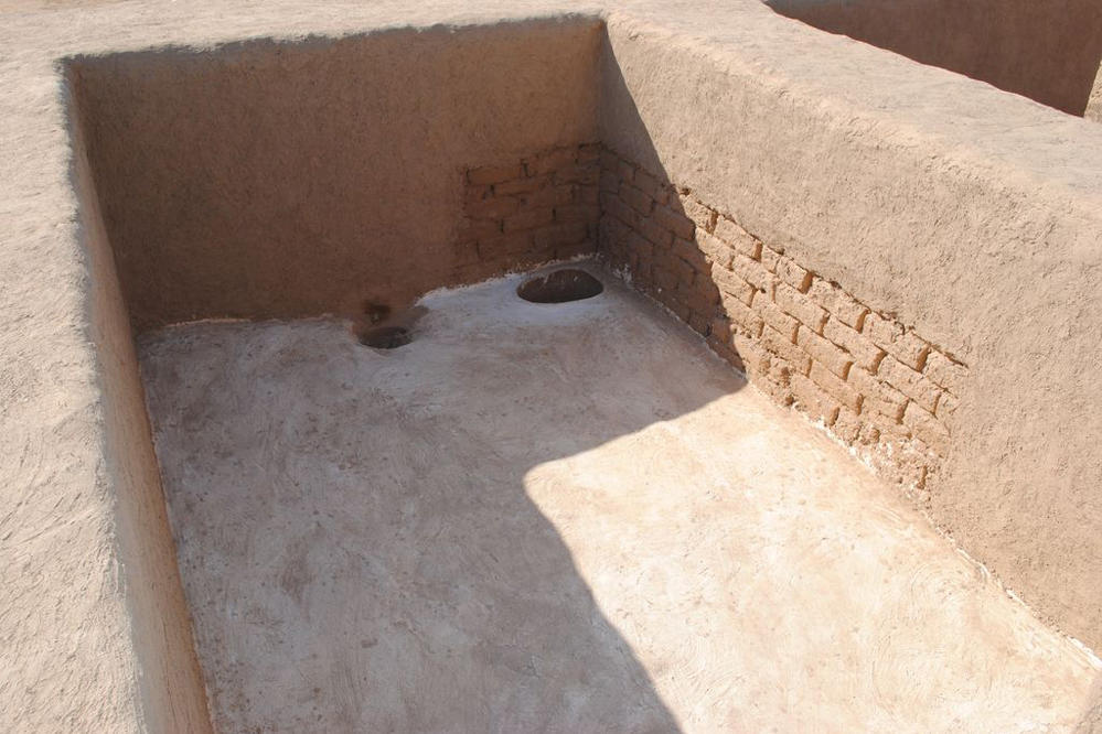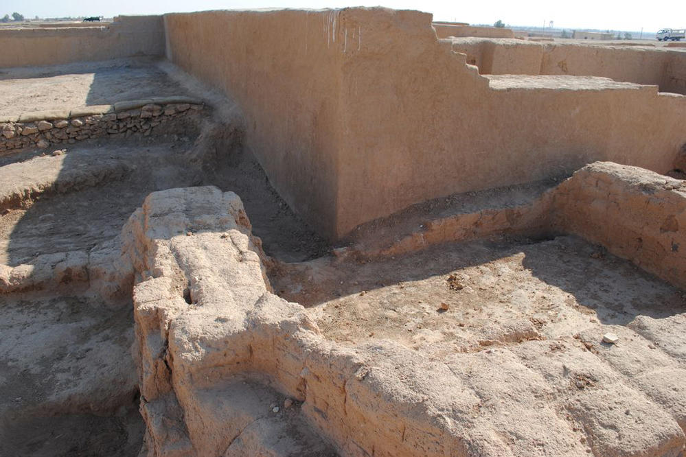 Das „Rote Haus“ in Dur-Katlimmu (Abb. 03) war eine assyrische Elitenresidenz, in der ein hoher Beamter mit dem Titel „Vertrauter des Königs“ seinen Amts- und Wohnsitz hatte. Die Biografie des Gebäudes erstreckt sich von etwa 630 bis 540 v. Chr., ist also gleich alt wie der Turm zu Babel. Seine Grundfläche beträgt 5400 Quadratmeter. 85 Räume verteilen sich über drei Gebäudeflügel. Funktional gehört der Nordflügel zur amtlichen Verwaltung, der Ostflügel zum Empfang und der Westflügel diente zum Wohnen. Die Mauern sind 1,60 Meter bis 1,20 Meter breit. Da drei Treppenhäuser ausgegraben wurden, ist das Gebäude zumindest teilweise zweistöckig zu rekonstruieren. Da die Mauern des „Roten Hauses“ streckenweise bis zu einer Höhe von zwei Metern erhalten waren, mussten zwingend Überlegungen angestellt werden, wie diese konserviert werden können, denn die Alternative des Zuschüttens wäre in jedem Fall auch sehr aufwändig geworden.