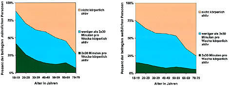 Sowohl bei den Personen, die das Kriterium erreichen, als auch bei den Personen, die nur in einem geringen Ausmaß aktiv sind, lässt sich beobachten, dass sich die Aktivitäten schon im frühen Erwachsenenalter (18 bis 39 Jahre) reduzieren. Dieser Trend stagniert zwar im mittleren Erwachsenenalter, verstärkt sich im hohen Erwachsenenalter jedoch wieder. Dabei ist der Anteil der Männer, die sich nach den Empfehlungen richten, in fast allen Altersgruppen doppelt so hoch wie der Anteil der Frauen. Möchte man das Aktivitätsverhalten beeinflussen, ist es bedeutsam, diese altersspezifischen Verläufe zu berücksichtigen.