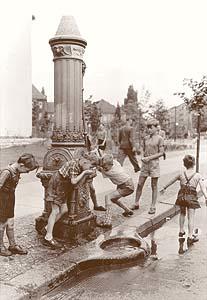 Aus Fallrohren an den Häuserwänden floss das Regenwasser von den Dächern über die Bürgersteige in die Rinnsteine, was in den Wintermonaten aufgrund von Glätte eine beträchtliche Gefahr für die Fußgänger darstellte.