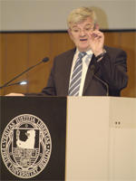 Der ehemalige Bundesaußenminister wusste sein Publikum zu fesseln. Unter dem Titel „Europa und Amerika: Über die Zukunft einer schwierigen Freundschaft“ beklagte Fischer einen „transatlantischen Drift“ seit dem Ende des Kalten Krieges: auf der einen Seite die starke und mittlerweile alleinige Supermacht USA, auf der anderen Seite ein schwaches, vielstimmiges Europa. Um das transatlantische Verhältnis auch weiterhin partnerschaftlich gestalten zu können, müsse sich der alte Kontinent als geeintes Europa präsentieren, beschwor Fischer in seiner Rede, in der er sich auch mit dem neuen Rollenverständnis Amerikas in den globalen Machtverhältnissen auseinandersetzte.