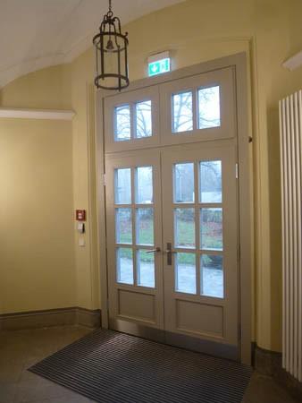 Im Äußern und Innern wurden behutsam nicht bauzeitliche Einbauten entfernt und originale Bausubstanz restauriert. Ergänzungen wie die neue Eingangstür wurden formal an die ursprüngliche Gestaltung angelehnt.