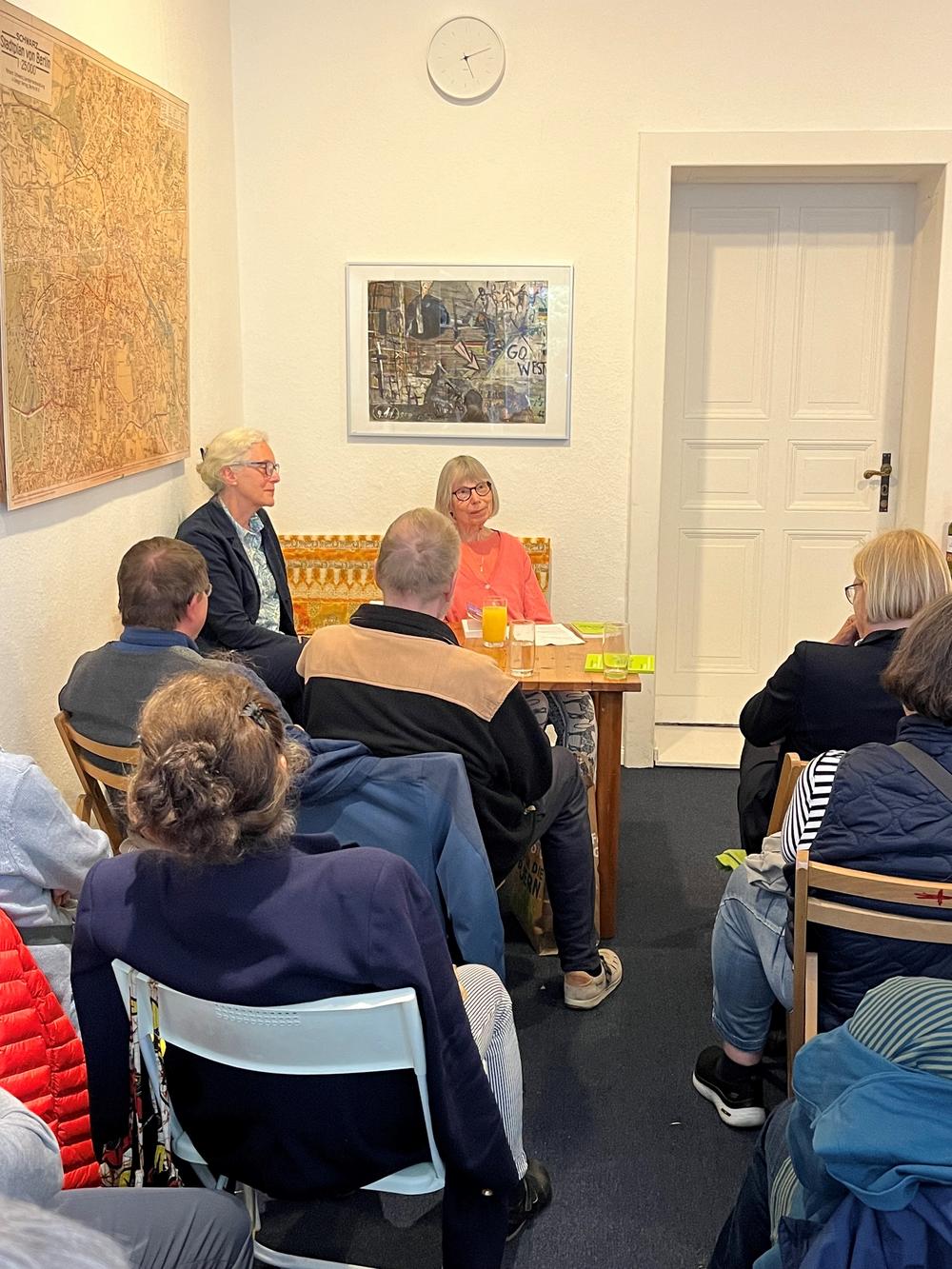 Ein literarischer Abend der besonderen Art – am 19. Juni 2024 lasen Cornelia Dildei und Gretchen Dutschke aus dem Buch “Auf stacheligen Wegen zur Befreiung – Immer wieder Aufbruch und Neuanfang”. Im Mittelpunkt des Buches steht Gretchen Dutschke als Person, die gelesenen Passagen gaben bildliche, ehrliche und kurzweilige Einblicke in verschiedene Phasen ihres bewegten Lebens, angefangen bei der Kindheit und Jugend in den USA, die ersten Partys in der High School, die Beatniks, ihre Begeisterung für Philosophie und der daraus resultierende Wunsch Deutsch zu lernen und die Entscheidung nach Deutschland zu gehen; wie es war, mit jemandem zu leben, der so im Fokus stand und schließlich ihr Idealismus und vielfältiges Engagement, das bis heute andauert. Auch mit diesem Buch ist es ihr Anliegen, der jungen Generation ein Vorbild zu sein und Demokratie und Gleichberechtigung zu fördern.