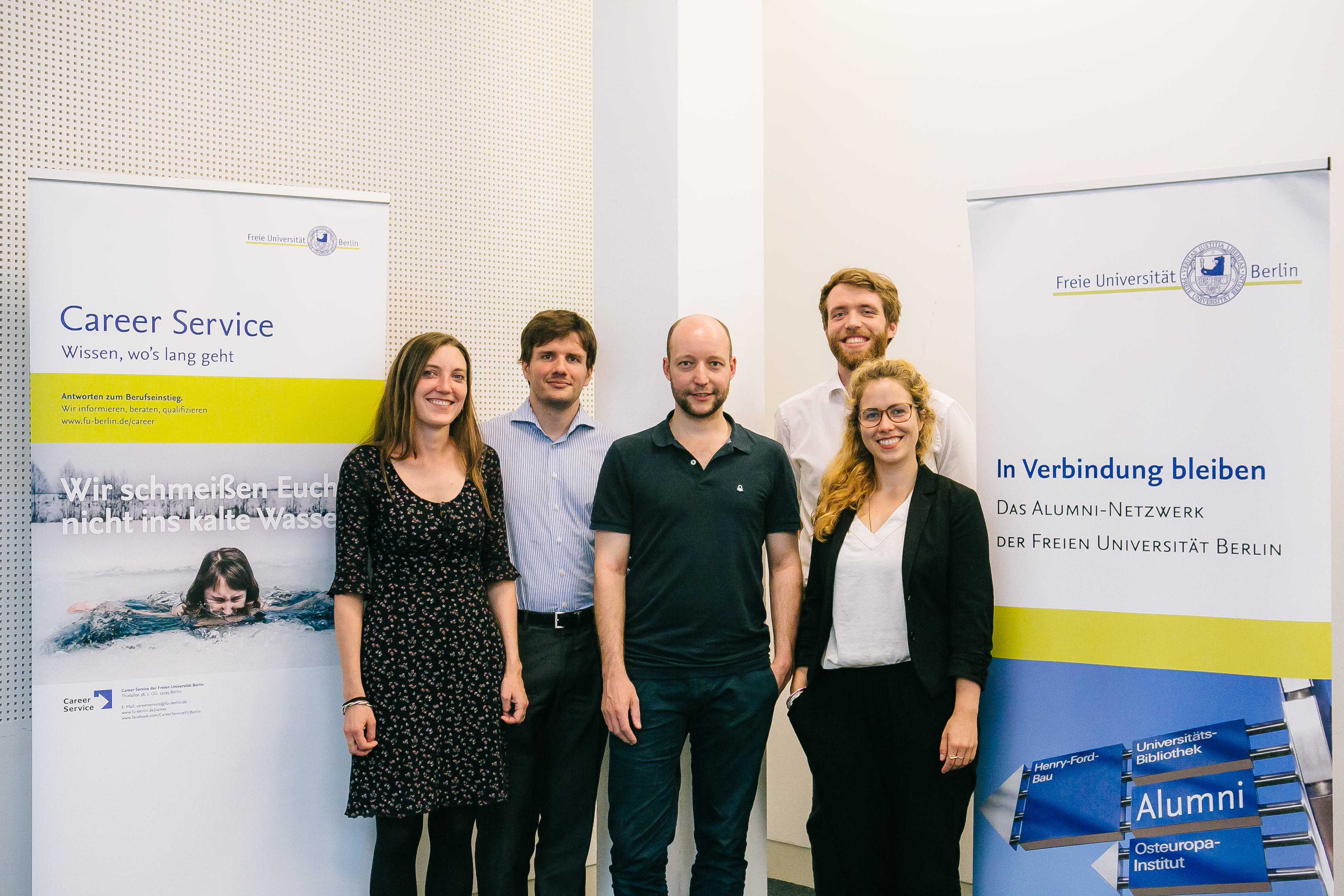 Teilten ihre Erfahrungen mit den Studierenden: Die Alumni Dr. Franziska Börner, Helge Schröder, Tobias Bargmann, Tim Rauschan und Beatrice Lange (v.l.n.r.)
