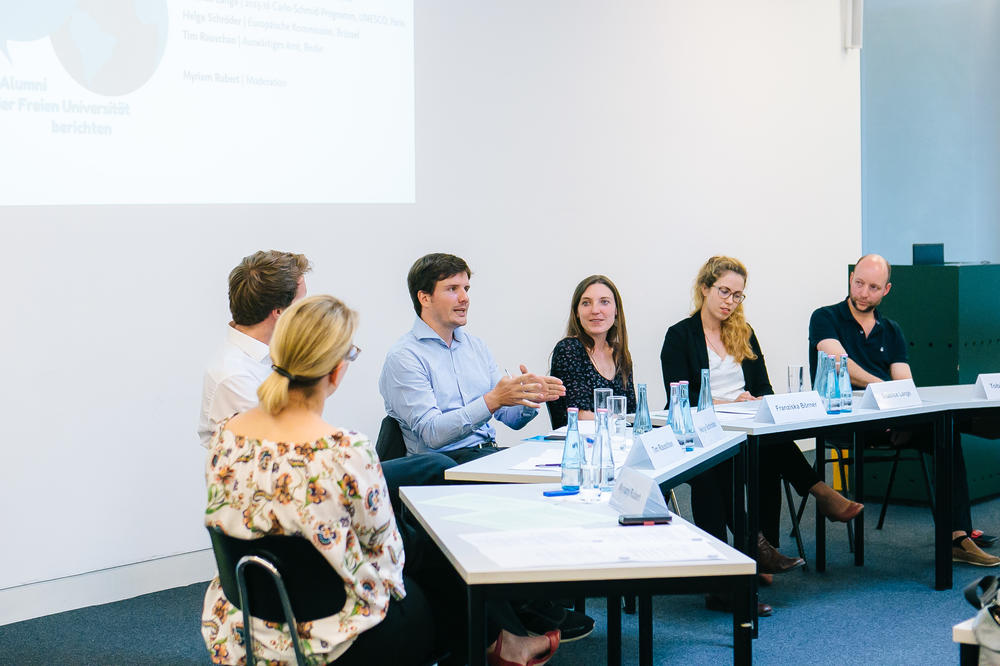 Jung, engagiert und berufserfahren im internationalen Umfeld. Auf die Absolventinnen und Absolventen der Freien Universität, die bei der Veranstaltung „Karrierewege in Internationalen Organisationen – Alumni der Freien Universität berichten“ ihre Erfahrungen teilten, trifft dies zu. Die Studierenden, die an der Veranstaltung teilnahmen, bekamen dennoch keine lückenlosen Lebensläufe und polierten Erfolgsgeschichten präsentiert. Mehr als einmal zeigte sich ein kollektives Lächeln auf den Gesichtern, wenn die Alumni mit ihrer Ehrlichkeit den Teilnehmerinnen und Teilnehmern einen Stein vom Herzen nahmen: Nein, es muss nicht alles von Anfang an einem festen Pfad folgen. Ja, auch erfolgreiche Menschen erhalten Bewerbungsabsagen. Und so toll eine Stelle auch klingen mag, wenn sie nicht zur eigenen Persönlichkeit oder den Interessen passt, dann darf man auch ruhig einmal „Nein“ sagen.