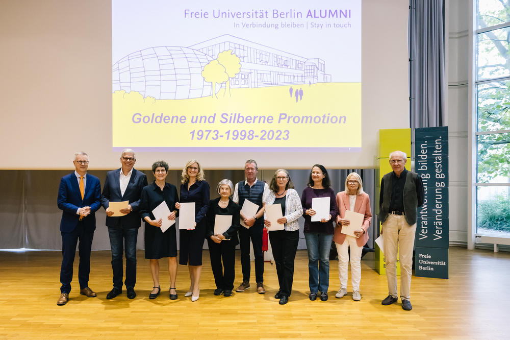 25 plus 50 macht 75 - passend zum 75. Jubiläumsjahr der Freien Universität fand am 15. September 2023 die Feier der Goldenen und Silbernen Promotion 1973 - 1998 - 2023 statt. Der Präsident Professor Dr. Günter M. Ziegler begrüßte die Jubilarinnen und Jubilare im großen Hörsaal in der Rost- und Silberlaube zum Festakt und zur feierlichen Urkundenübergabe.