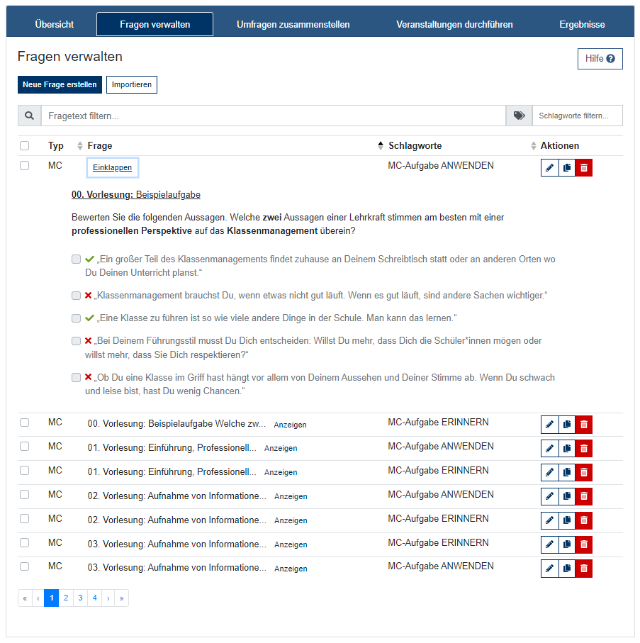Die Integration von Umfragen und Quizzes kann die Lehre didaktisch sinnvoll unterstützen. Mit Audience-Response-Systemen (ARS) können Studierende mit wenig Aufwand aktiv in den Lehrprozess einbezogen werden, indem sie sich zum Thema einbringen oder Feedback auf eine Frage geben. Durch die aktive Auseinandersetzung mit den Inhalten steigt die Aufmerksamkeit und die Lernenden können sich stärker eingebunden fühlen. Dies kann sich förderlich auf Motivation und Lernerfolg auswirken. |