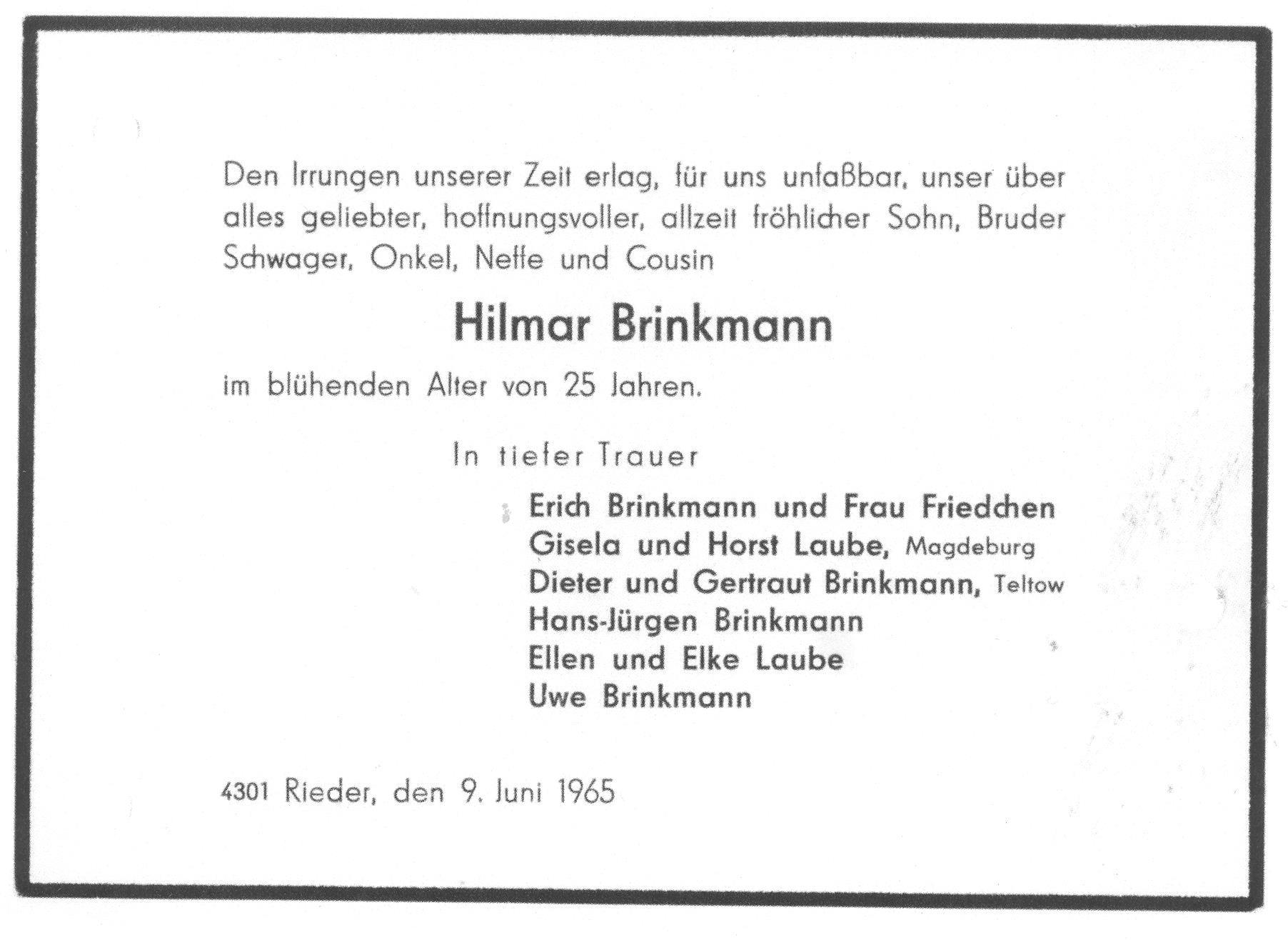 Am 27. Mai 1965 besuchte Hilmar Brinkmann seine ältere Schwester in Magdeburg. Sie ahnte nicht, dass dies der letzte Besuch ihres Bruders sein würde. Für den Folgetag verzeichnete der Wetterdienst für die Gegend um Schnackenburg an der Elbe bereits angenehme 20 °C . Aber die Temperatur des Flusses lag lediglich bei 12 bis 14 °C . Unter diesen Umständen wagte Hilmar Brinkmann dennoch die Flucht über die Elbe. Dieses Wagnis endete für den jungen Ingenieur tödlich.