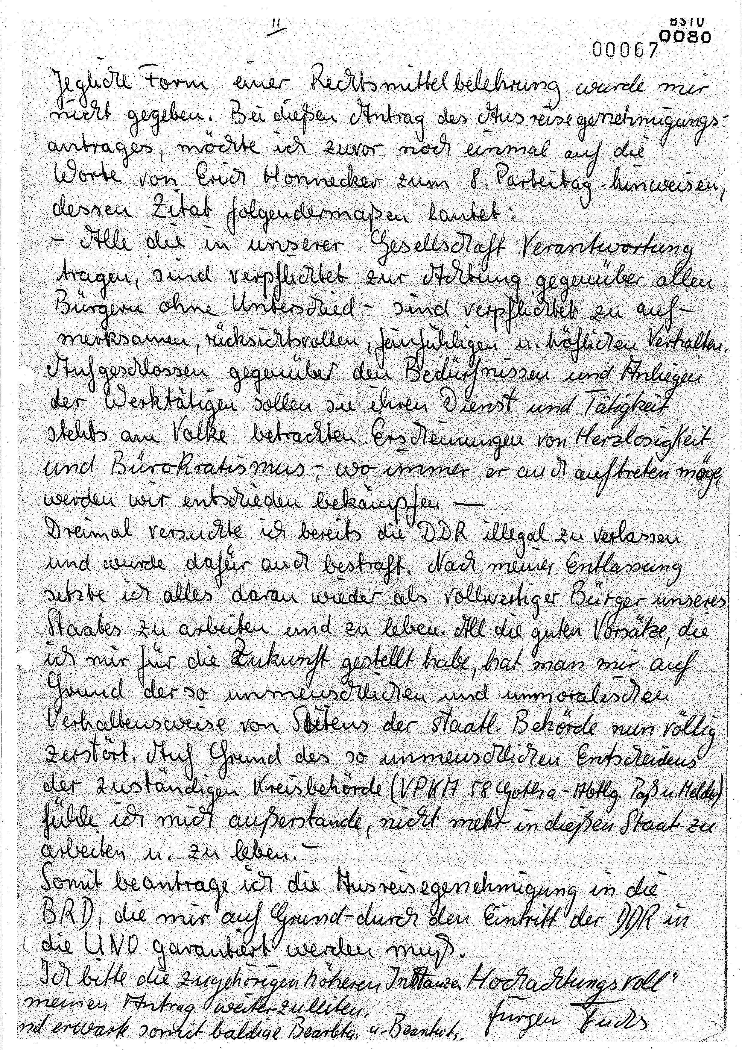 Als im Juni 1976 nach kurzer schwerer Krankheit seine Mutter starb, verweigerte die DDR seinem in Westdeutschland lebenden Bruder die Einreise zur Beisetzung. Daraufhin stellte Jürgen Fuchs einen Ausreiseantrag. Darin berief er sich auf Erich Honeckers Rede auf dem 8. Parteitag der SED, in der dieser versprach, die Partei werde „Erscheinungen von Herzlosigkeit und Bürokratismus – wo immer sie auch auftreten – entschieden bekämpfen”. Mit der Weigerung der Behörden, seinen Bruder zur Beerdigung der Mutter in die DDR einreisen zu lassen, seien „all die guten Vorsätze, die ich mir für die Zukunft gestellt habe” durch die „so unmenschlichen und unmoralischen Verhaltensweisen von Seiten der staatlichen Behörde nun völlig zerstört”. Am 16. Juli 1976 suchte Jürgen Fuchs die Lokalredaktion der SED-Bezirkszeitung Freie Erde auf und bat um die Veröffentlichung eines Artikels, in dem er die gegen seinen Bruder verhängte Einreisesperre kritisierte. Man verwies ihn des Hauses und informierte den Staatssicherheitsdienst. Dessen Kreisdienststelle Neustrelitz überwachte Fuchs seit Mai 1976 in einer „Operativen Personenkontrolle” (OPK). Aus abgefangenen Briefen und durch den Verrat einer Freundin wusste die Stasi, dass Fuchs zur Flucht aus der DDR entschlossen war, falls sein Ausreiseantrag abgelehnt würde. Nachdem man ihn fast zwei Monate im Ungewissen ließ, schrieb Fuchs an die Redaktion des ZDF-Magazins und bat um Unterstützung. Aus Protest gegen die Behördenschikanen verweigerte er am 17. Oktober 1976 die Stimmabgabe zur Volkskammerwahl. Als ihm Anfang November 1976 die Ablehnung seines Ausreiseantrages zuging, stellte er umgehend einen erneuten Antrag auf Übersiedlung in die Bundesrepublik. Am 7. Dezember 1976 erschien Jürgen Fuchs in der Neustrelitzer Behörde für das „Paß- und Meldewesen” und erklärte in erregtem Ton, er wolle nun „sich selbst die Staatsbürgerschaft der DDR aberkennen” und alle seinen Personalunterlagen zurückgeben. Es gelang dann den Behördenmitarbeitern offenbar, Fuchs zu beruhigen und auf die weitere Bearbeitung seines Übersiedlungsantrages zu vertrösten.