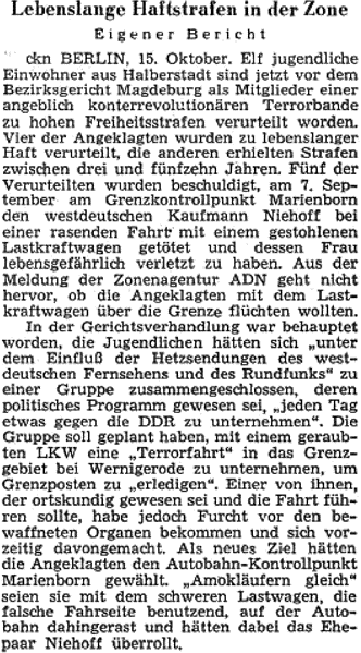 Die Berliner Zeitung machte am 14. Oktober 1961 unter der Schlagzeile „Die Mörder von Halberstadt“ eine „konterrevolutionäre Bande“ für Niehoffs Tod verantwortlich und behauptete, „die Verbrecher wurden vom Westen angeleitet“. Das Neue Deutschland berichtete einen Tag später unter der Überschrift „Terrorbande erhielt gerechte Strafe“, der Erste Strafsenat des Bezirksgerichtes Magdeburg habe eine elfköpfige „Terrorbande“ aus Halberstadt zu hohen Haftstrafen verurteilt. „Fünf Verbrecher hatten am 7. September dieses Jahres in Marienborn vorsätzlich den westdeutschen Kauf- mann und Vater von fünf unmündigen Kindern Heinrich Niehoff getötet und seine Frau lebensgefährlich verletzt. Das Ehepaar befand sich auf dem Wege zur Leipziger Herbstmesse. Vier der Angeklagten, die sich als die politischen Inspiratoren erwiesen haben, wurden am Donnerstag zu lebenslänglicher Haft, die weiteren Bandenmit- glieder zu Freiheitsstrafen zwischen 15 und drei Jahren verurteilt.“ (Recherche: jk, jos., MP, US; Autor: jos.)