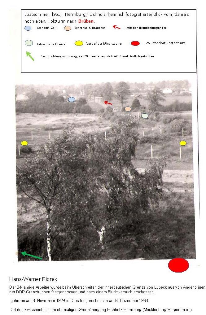 Am Donnerstag, dem 5. Dezember 1963, versuchte Hans-Werner Piorek abends über den Grenzübergang Lübeck-Schlutup zurück in die DDR zu gelangen, doch die Einreise wurde ihm verwehrt. Man schob den jungen Mann zwei Stunden später wieder nach Lübeck ab. Eine winterlich kalte Nacht mit vereinzelten Niederschlägen folgte. Die Polizei griff den vermeintlichen Stadtstreicher auf. Es war noch dunkel, als Zollbeamte ihn am nächsten Morgen am ehemaligen Grenzübergang Eichholz-Herrnburg bemerkten. Sie übergaben ihn der Lübecker Polizei, die ihn nochmals überprüfte. Kurz nach 7 Uhr erschien er wieder in Eichholz. Diesmal hatte er eine Bescheinigung dabei, dass nichts gegen ihn vorlag. Von seinem Vorhaben, hier und jetzt die Grenze zu überschreiten, ließ er sich trotz Warnungen nicht abbringen.
