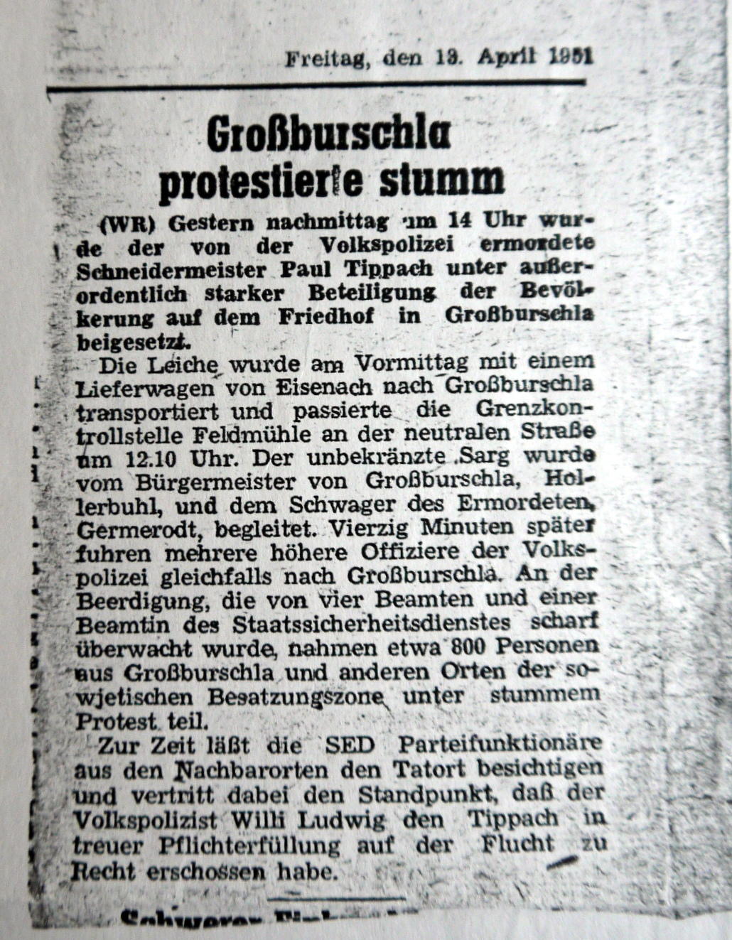 Bericht über die Beerdigung Paul Tippachs, Werra-Rundschau 19. April 1951.