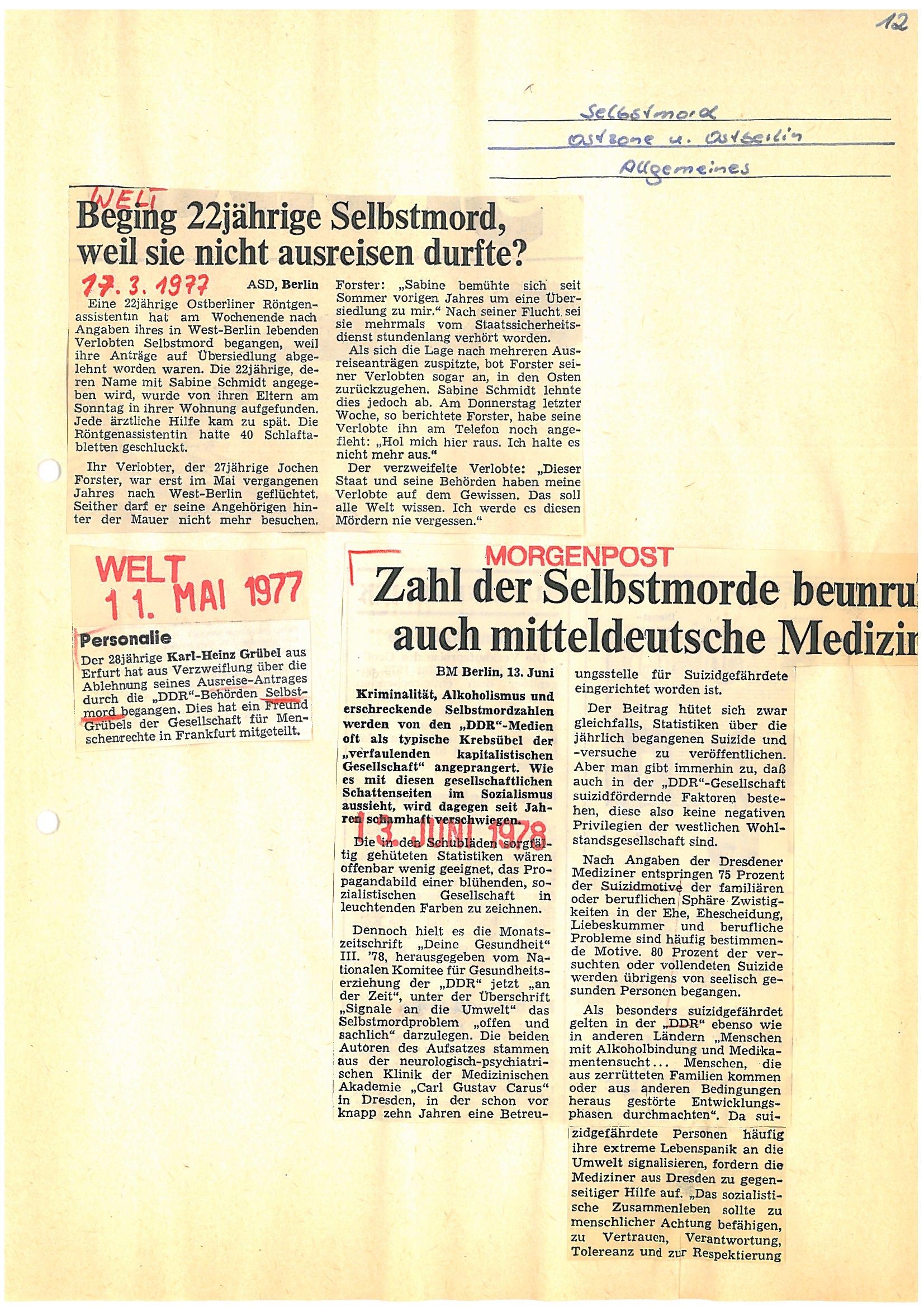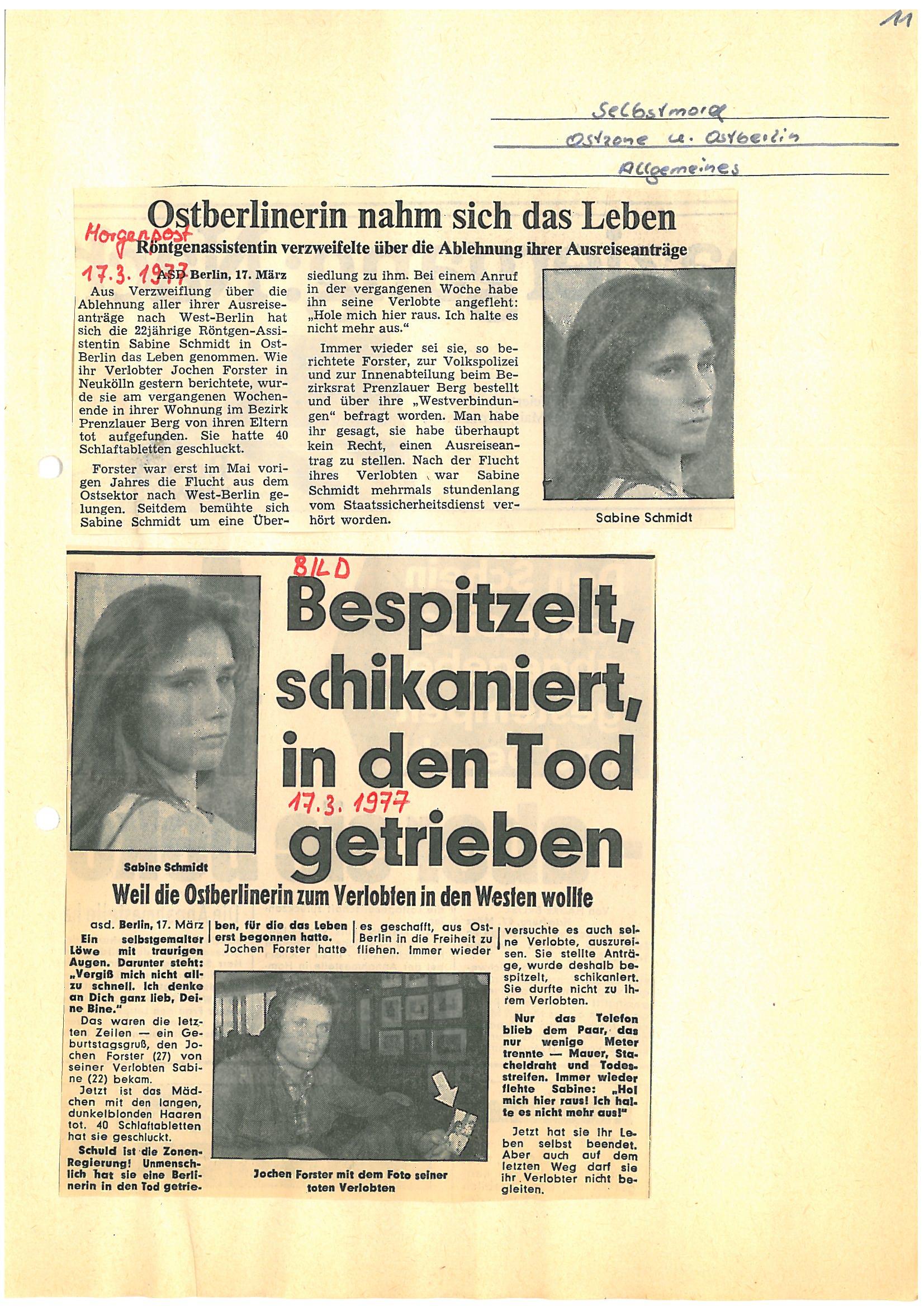 Nach der Rückkehr aus dem Urlaub fanden die Eltern Sabine Schmidt am 13. März 1977 in ihrer Berliner Wohnung tot auf. Die 22-Jährige nahm sich das Leben, nachdem ihr die DDR-Behörden eine Ausreise nach West-Berlin verweigert hatten und sich ein geplanter Fluchtversuch nicht verwirklichen ließ.