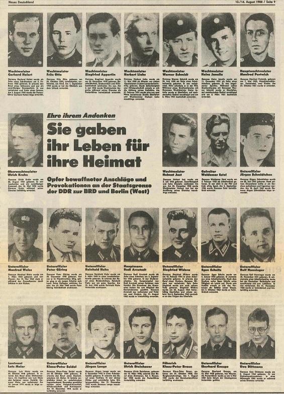 Neben den DDR-Bürgern die bei Fluchtversuchen ums Leben kamen und den getöteten Zivilpersonen aus dem Westen gibt es eine weitere bislang wenig beachtete Opfergruppe. Die SED-Propaganda ehrte offiziell durch Denkmäler, Straßen- und Schulnamen ausgewählte DDR-Grenzer, die im Dienst uns Leben gekommen waren. Erich Honecker würdigte anlässlich des 40. Jahrestags der Grenztruppen am 28. November 1986 namentlich 17 dieser DDR-Grenzer. Dabei handelte es sich ausschließlich um solche Fälle, die nach Schusswechseln mit Angehörigen der westalliierten Streitkräfte, dem Bundesgrenzschutz oder westlichen Zivilpersonen zu beklagen waren sowie um Angehörige der Grenztruppen, die von fahnenflüchtigen Kameraden erschossen wurden.