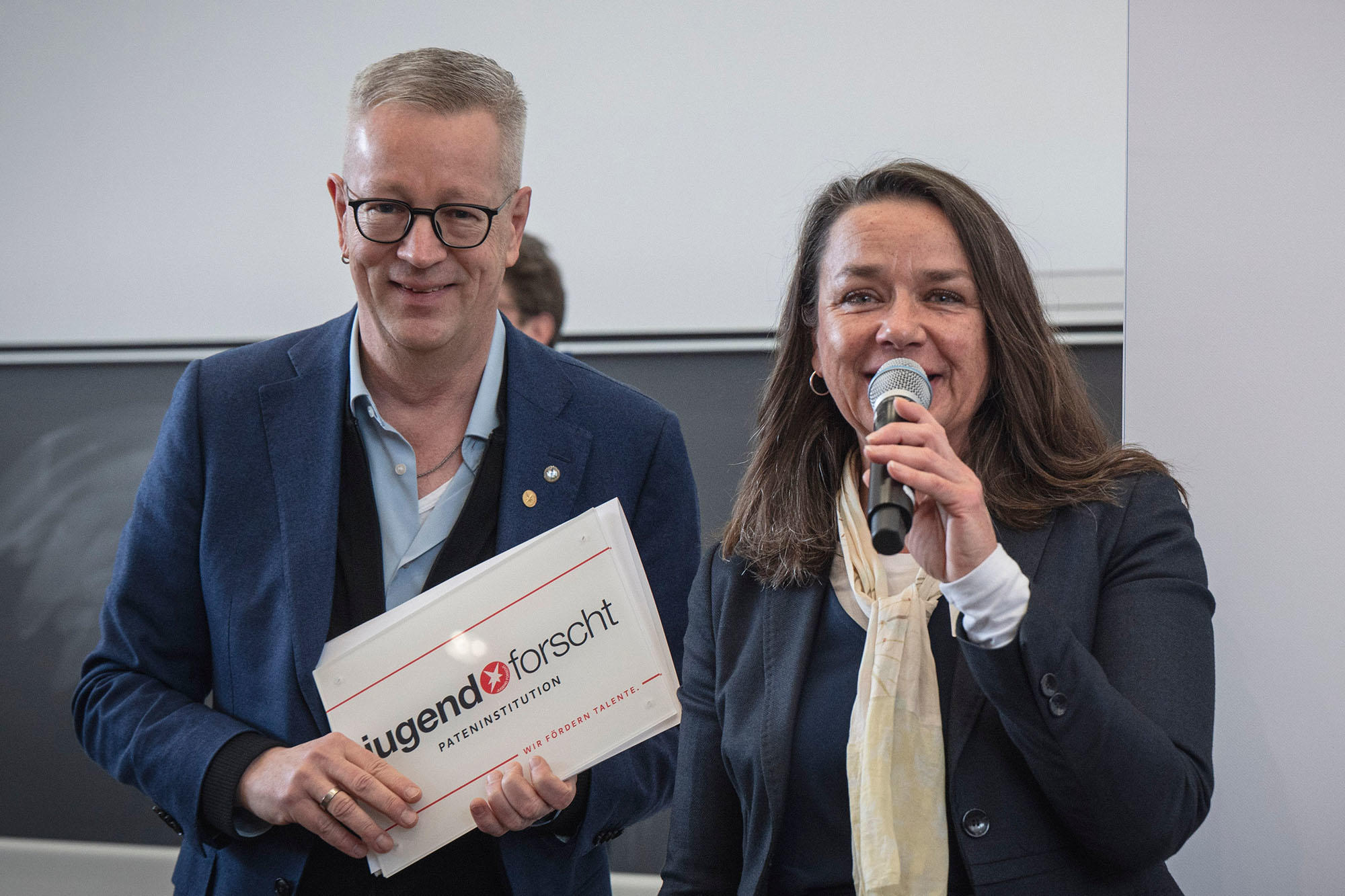 Günter M. Ziegler, Professor für Mathematiker und Präsident der Freien Universität, begrüßte die Teilnehmenden des Regionalwettbewerb Berlin-Dahlem. Christine Stahlschmidt, Netzwerkkoordinatorin bei Jugend forscht, übergab ihm die Plakette, die alle Jugend forscht-Austragungsorte ziert. Die Situation rief Erinnerungen wach: 1979 hatte der Uni-Präsident selbst zum ersten Mal bei Jugend forscht teilgenommen, 1982 wurde er Bundessieger auf dem Fachgebiet Mathematik. Eine wichtige Sache habe er damals mitgenommen, betonte er: „Das Selbstbewusstsein: Ich habe gemerkt: Ich kann was.“ Dass die Freie Universität Berlin nun erstmals Gastgeberin ist, freut ihn besonders: „Wir wollen zeigen, dass Forschung Spaß macht, offen ist und überall beginnen kann – auch schon im Klassenzimmer oder in der Freizeit.“