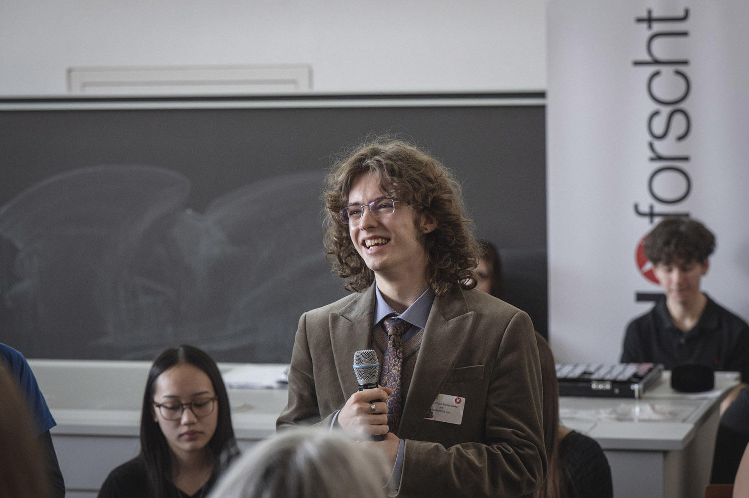 Manuel Santos Gelke studiert Biochemie an der Freien Universität Berlin, hat früher selbst bei Jugend forscht teilgenommen und war als Juror beim Regionalwettbewerb dabei. Auf der Preisverleihung beantwortete er Fragen der Teilnehmenden, etwa: Lohnt es sich, bei Jugend forscht mitzumachen? Klares Ja! Die Erfahrung habe ihm bei der Entscheidung für sein Studienfach geholfen, ebenso beim Studium und bei Bewerbungen.