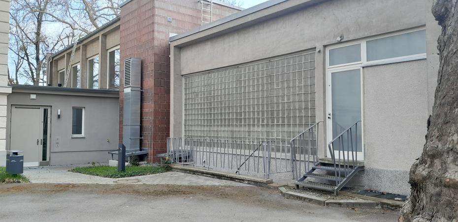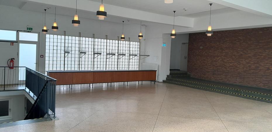 Barrierearm: Über den hinteren Eingang kann man den Bühnenbereich des Hörsaals sowie ein WC für Rollstuhlfahrer ebenerdig erreichen. Das Garderobenfoyer ist nur über Stufen erreichbar.