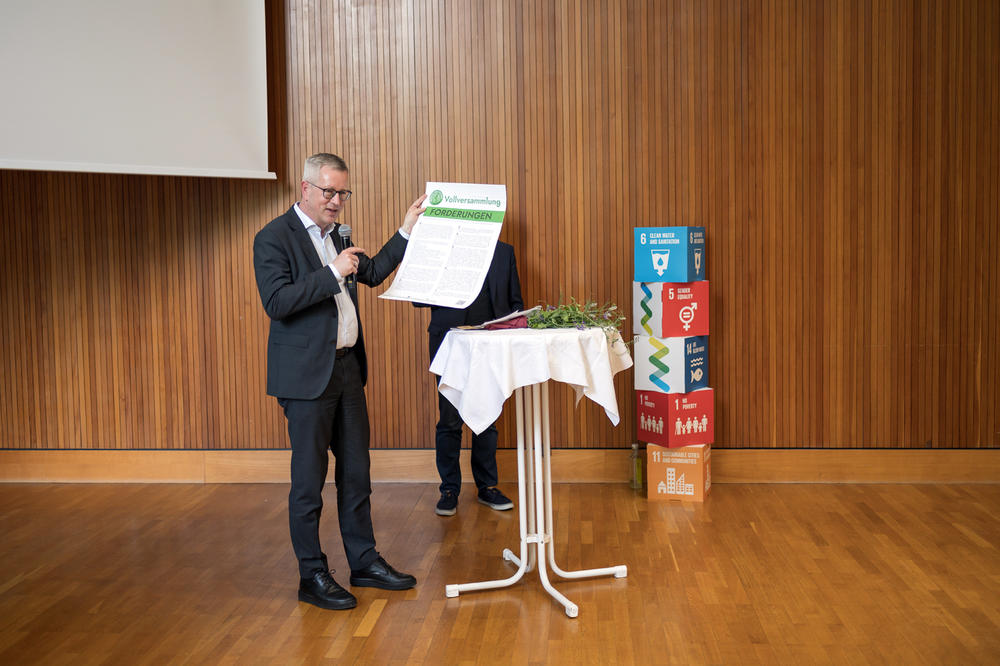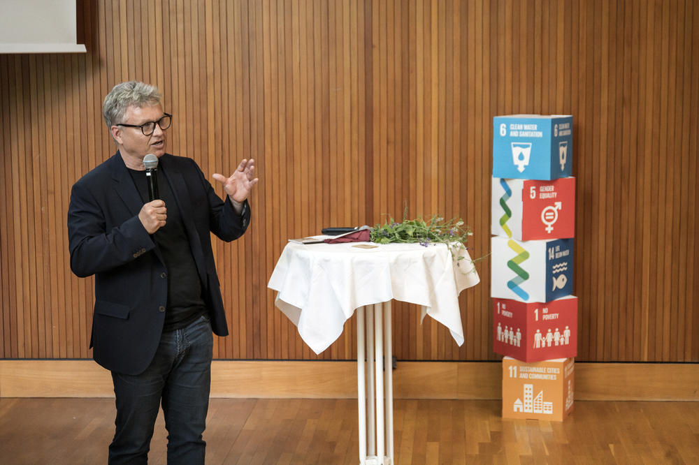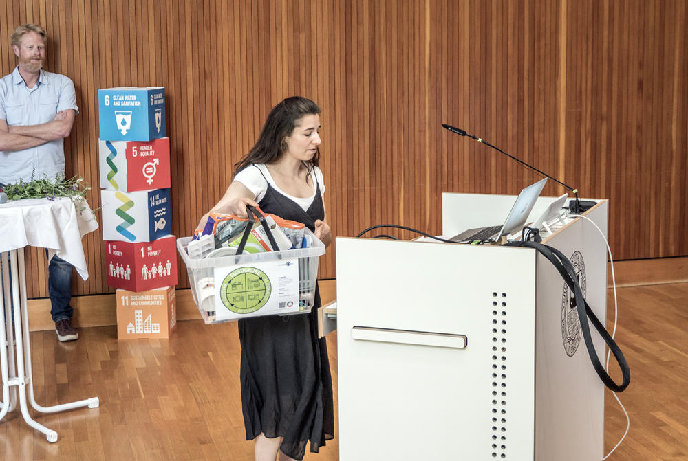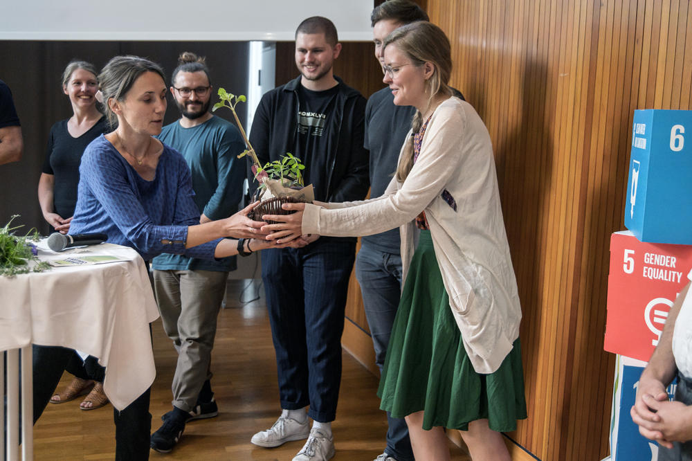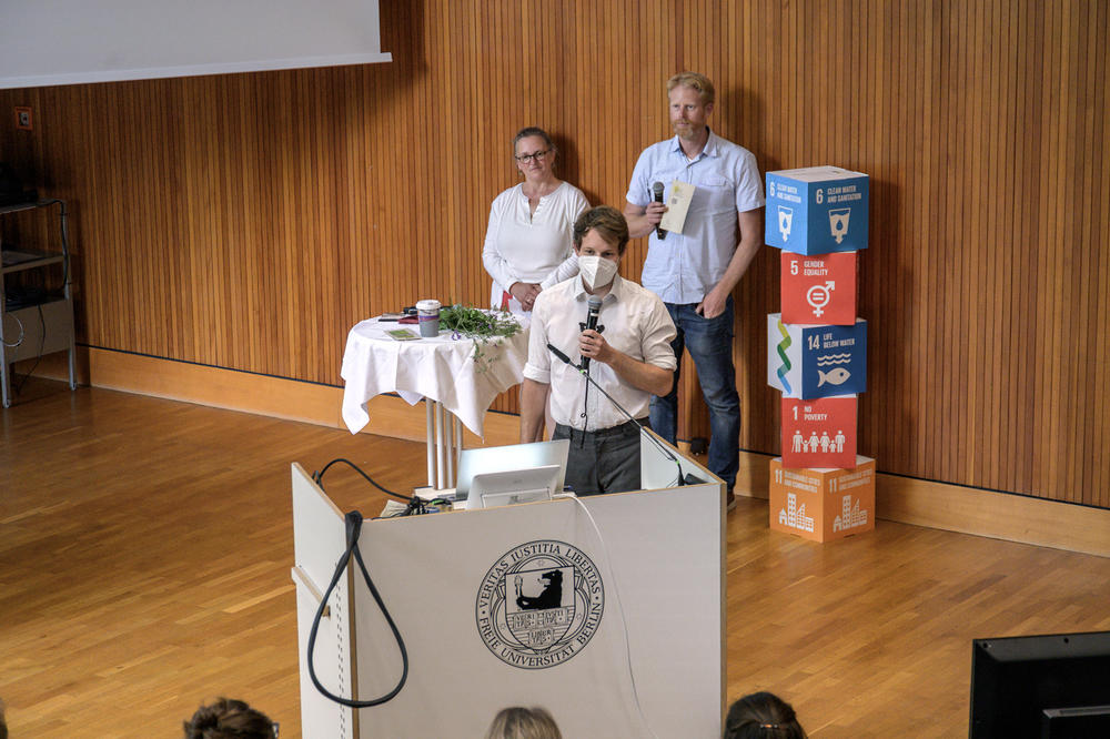 Eingeleitet hatten Professor Günter M. Ziegler und Andreas Wanke mit ihrem persönlichen Zwischenfazit zur FU-Klimanotstandserklärung und was eine Freie Universität alles leisten kann. Carla trug ihr Gedicht vor, welches sie im ABV-Kurs geschrieben hatte. Steffen Terberl, Prof. Dr. Inka Bormann, Dr. Mandy Singer-Brodowski und Andreas Wanke stellten die jeweiligen Personen hinter den Projekten vor. Die Projektteams hatten jeweils 3 Minuten Zeit, die Ziele ihrer Idee, was bis dato geschehen ist und was noch gebraucht wird, vorzustellen. Das Publikum konnte im Anschluss FeedForward geben. Am Ende gab es einen Ausblick zu den kommenden Aktivitäten rund um nachhaltige Entwicklungen und eine kleine Preisverleihung.