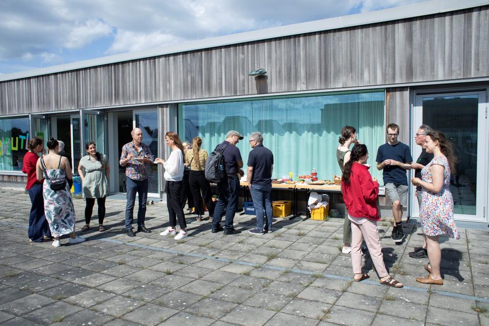 Wer noch konnte, genoss beim Get-Together auf der Dachterrasse der Holzlaube den Austausch mit den Projektteams.