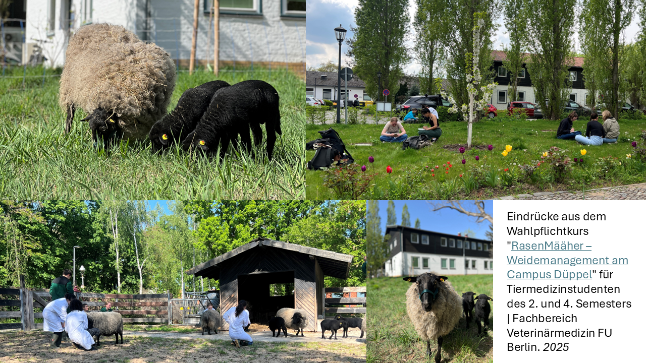 Außerdem fand unser Wahlpflichtkurs "RasenMääher – Weidemanagement am Campus Düppel" für 14 Studierende der Vorklinik des 2. und 4. Semesters statt. Da der Kurs erfolgreich - Eindrücke gibt es hier - war, bieten wir diesen in 2026 wieder an.