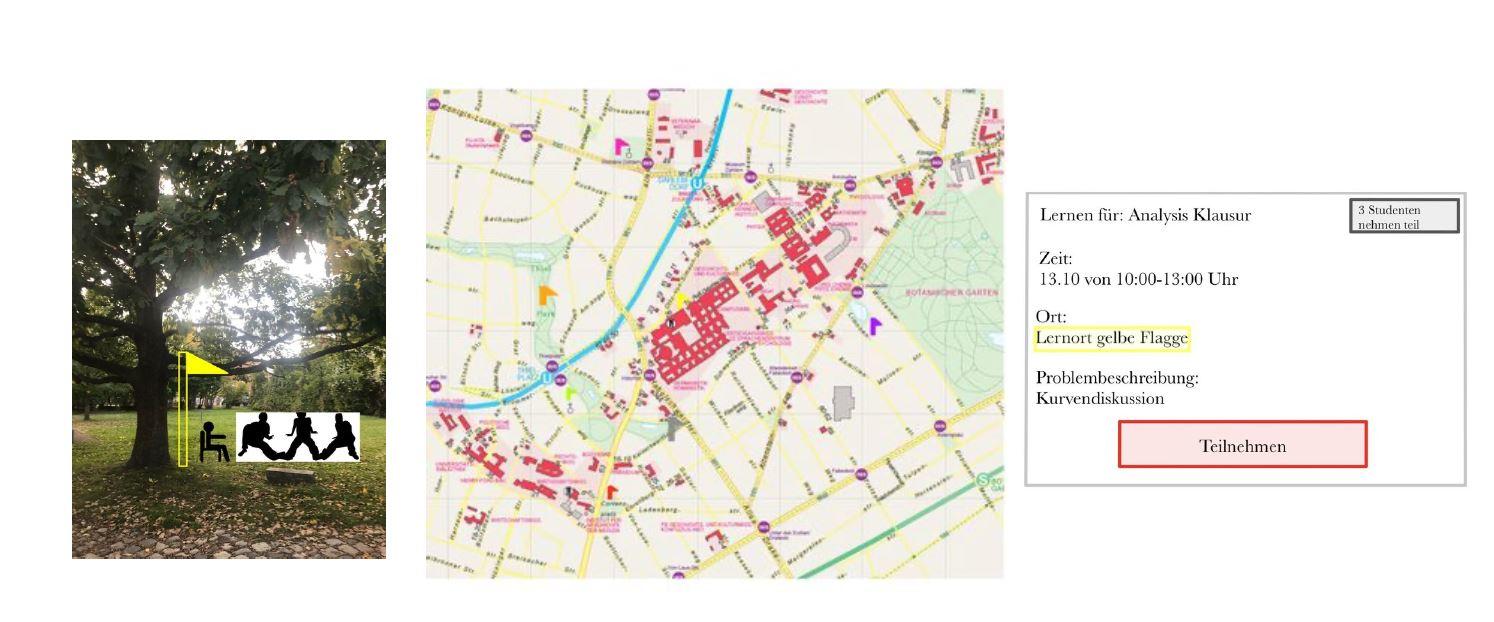 Ziel des zweiten Projektes war die Entwicklung einer App, die den Studierenden die Vernetzung untereinander, z.B. zum gemeinsamen Lernen oder thematischem Austausch ermöglicht. In der App können "Kontaktanzeigen" mit Informationen zu Treffpunkt und Uhrzeit geschaltet werden. Damit andere Studierende den Treffpunkt finden, ist in der App eine Karte enthalten, die den jeweiligen Standort anzeigt.