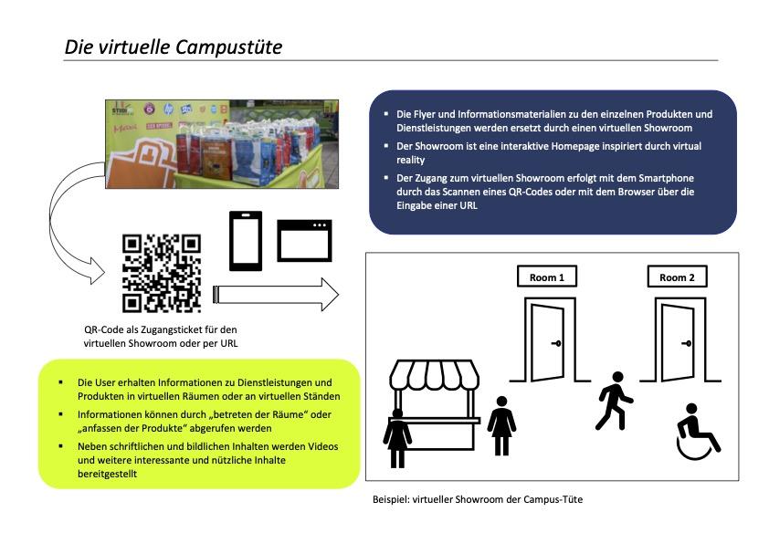 Hauptziel der zweiten Idee ist es, die Menge an Altpapier zu reduzieren, das durch ungewollte Flyer und Coupons in der Campus-Tüte entsteht. Mit Hilfe eines QR-Codes sollen die Studierenden stattdessen die Möglichkeit haben, auf die Angebote und Informationen der "VR-Campustüte" zugreifen zu können.