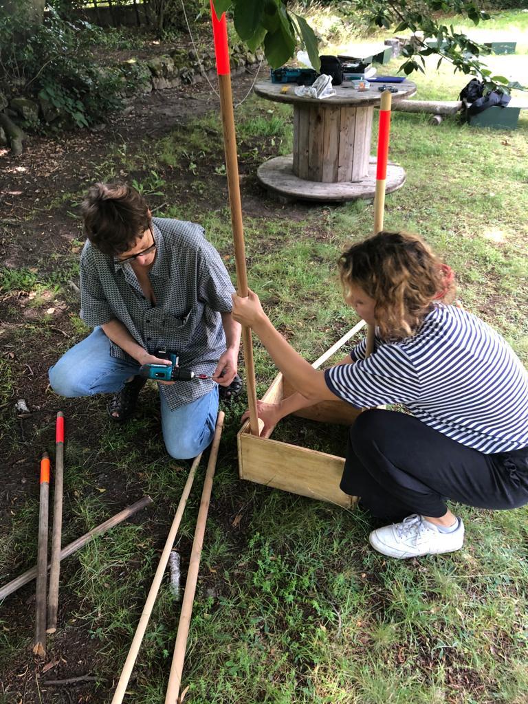 Die Rauminstallation setzt sich aus 53 neuen und alten Besenstielen zusammen. Diese schafft einen räumlichen Dialog zwischen dem etwas versteckten Garten, unserer Universität, dem Kino und der Nachbarschaft. Die Besen wurden spalierartig zusammengesetzt und in den Himmel gehoben. Im Zusammenspiel der unterschiedlichen Besenstiellängen, der krummen und geraden Formen, der Holztexturen und Farbe entsteht eine rhythmische Bewegung. Diese lädt ein, neugierig einzutreten und den Garten in all seiner wilden Vielfalt zu entdecken.
