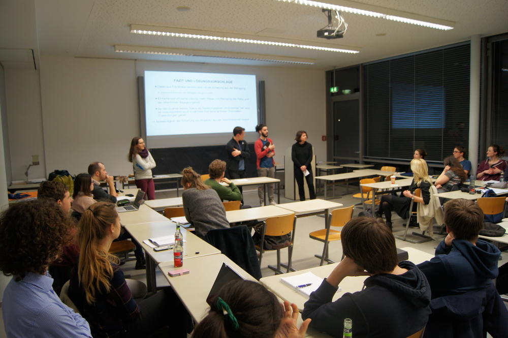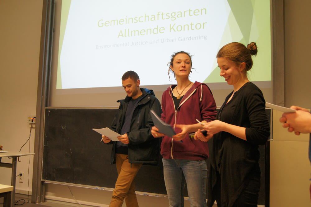 Daneben bestand die Möglichkeit , in Projektgruppen konkrete Problemstellungen praktisch zu bearbeiten. Dafür wurden verschiedene stakeholder – z.B. aus NGOs, der Stadtverwaltung oder der Stabsstelle für Nachhaltigkeit der FU Berlin – einbezogen, die Einblicke in bestehende Problemkontexte ermöglichen. Mit der Hilfe von transdisziplinären Forschungsmethoden wurde der Gegenstand systematisch erschlossen und versucht, umweltgerechte Lösungsansätze für die spezifischen Kontexte zu entwickeln.